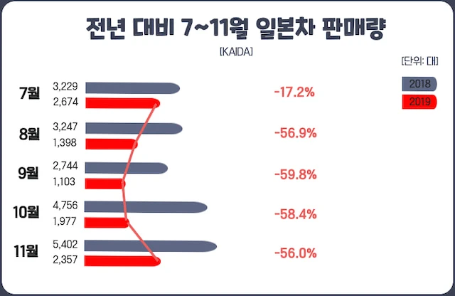 7~11월 일본차 판매량은 지난해 1만9,378대에서 올해 9,527대로 줄었습니다. 월별로 살펴보면 7월 감소폭은 17.2%였고 8월부터 11월까지는 지난해 판매량의 절반보다 적었습니다.