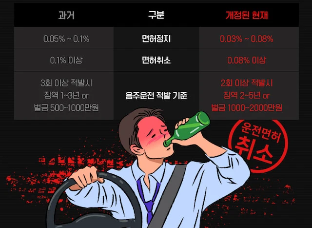 적발 시 처벌 수준도 높아졌습니다. 음주운전 2회 이상 적발 시 징역 2~5년 또는 벌금 1,000만~2000만 원으로 상향됐습니다. 아울러 이전까지는 음주운전 3회 적발 시 면허취소가 됐지만 이제는 2회로 강화됐습니다.
