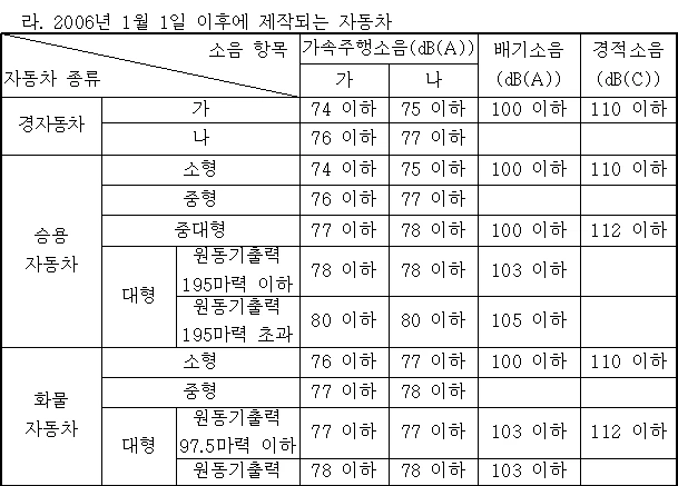 나. 음의 최대크기는 「소음ㆍ진동관리법」 제30조 및 제35조에 따른 자동차의 소음허용기준에 적합할 것