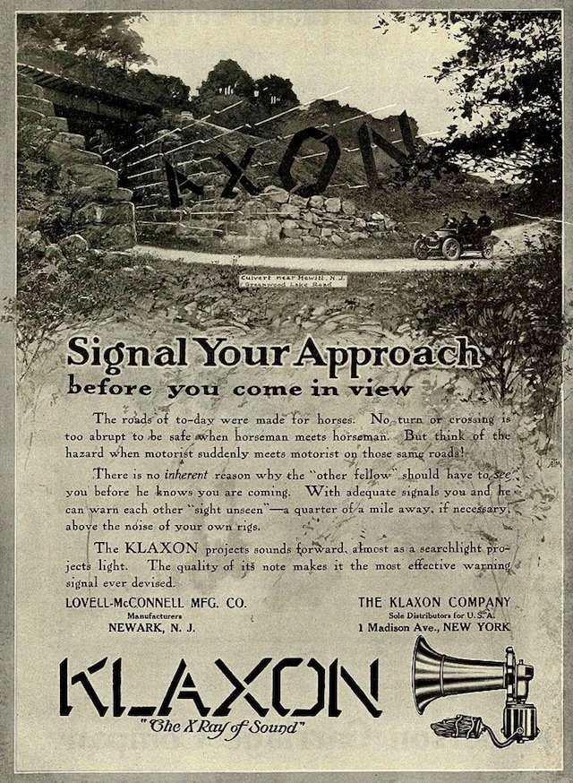 소리를 내어 차의 주행을 알린 건 1886년, 가솔린 자동차가 등장하기 시작할 무렵입니다. 프랑스에서 시작되었으며, 이때는 나팔에 연결된 원형의 고무공을 눌러 소리를 내는 방식. 그러나 이전에도 방법은 달랐지만 자동차의 움직임을 알리기도 했습니다. 바로 깃발을 사용해서죠. 증기를 사용했던 자동차가 지나갈 때 붉은 깃발을 든 사람이 함께 달려가며 행인들의 안전을 담당했습니다.