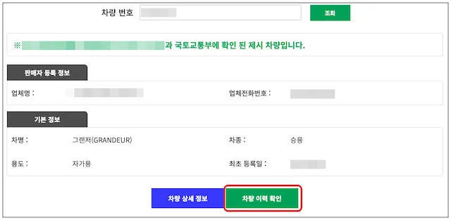 조회 결과 올바른 절차대로 등록된 중고차임을 확인했습니다. 이제 본격적으로 43만 원의 정비 이력을 봐야겠습니다. 조회된 화면에서 '차량 이력 확인' 버튼을 누르면 자동차 민원 대국민 포털(ecar.go.kr)로 이동(물론 애초에 여기 방문해 수리 이력을 볼 수 있음). 그러나 제대로 등록된 매물인지 확인하는 것도 중요해서 위의 과정을 먼저 소개한 것입니다.