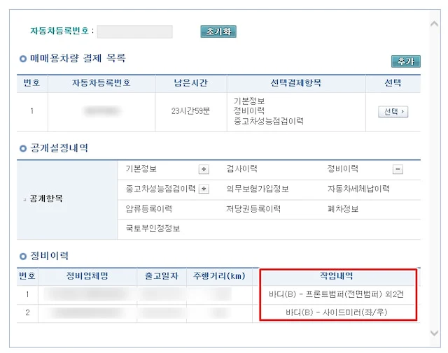 이렇게 수리 내역을 확인할 수 있게 된 것은 2017년부터입니다. 정부는 소비자의 '알 권리'를 보장하고자 소유자의 동의 없이 정비 이력을 공개하게 만들었습니다. 대신 개인 소유의 차는 이력을 공개하지 않습니다. 반드시 매매업자 명의로 되어 있는 상품용 중고차에 한해 정보를 공개합니다.