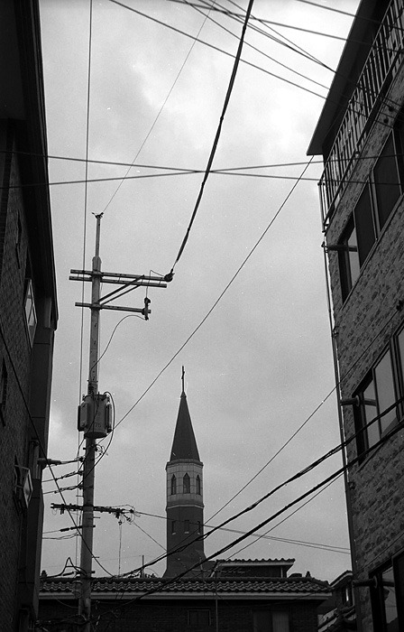 천국으로 가는 문이 있다고 믿는 사람들에게 가장 필요한 곳은 자신과 신이 소통하는 공간일 것이다. 그것이 신의 부름을 받는 자리라면 공간확보를 해야 하는 것은 당연한 이치지만 너무 생활속에 들어온 그런 공간은 외형적으로 심한 변질감을 생산한다. 편의점보다 많은 수의 첨탑은 신에게 가장 가깝게 다가가고자 하는 인간들의 날카로운 욕심을 대변한다.