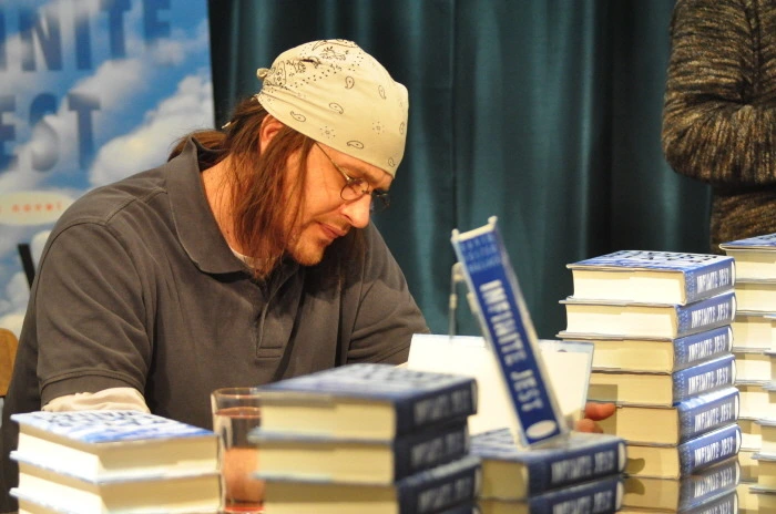 영화의 주인공은 극을 이끌어가는 롤링스톤지 기자역의 데이비드 립스키이지만 정작 중요한 인물은 우리 시대의 토마스 핀천 또는 존 어빙으로 추앙받는 미국 소설가 데이비드 포스터 월레스이다. 월레스는 1996년 출간한 자신의 두 번째 소설 [무한한 흥미(Infinite Jest)]로 평단의 극찬을 받으며 거장의 반열에 오른다. 이 소설은 [타임]지가 20세기 100대 영문소설로 선정하기도 했는데 무려 1000페이지에 달하는 엄청난 분량으로 윌리엄 깁슨의 [뉴로맨서]와 함께 '인터넷 소설'을 대표하는 작품으로 꼽히기도 했다. 물론 이 작품은 국내에는 아직 번역되지 않았다.