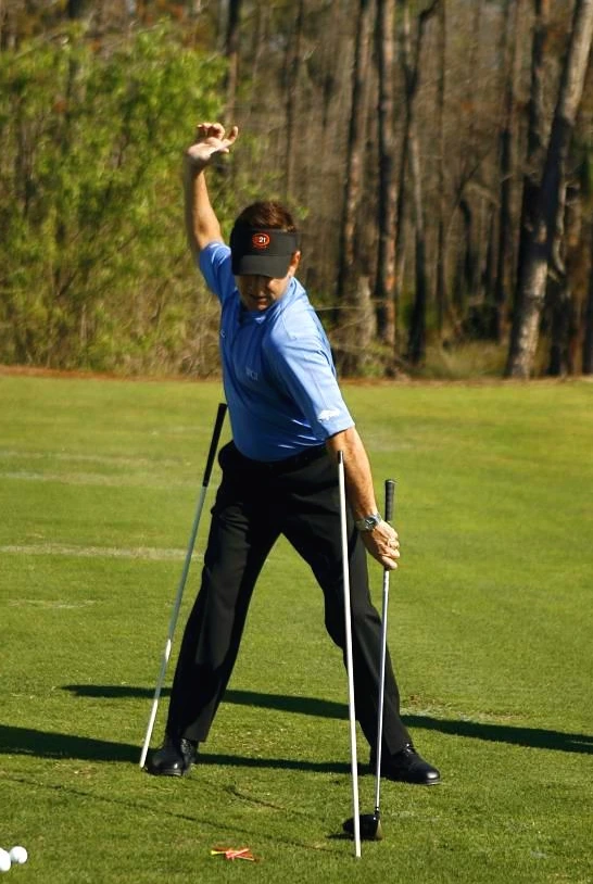 1. 오른팔을 뻗어 엄지가 하늘을 향하도록 하고 자신의 스윙 플레인 만큼 손바닥을 기울인다.