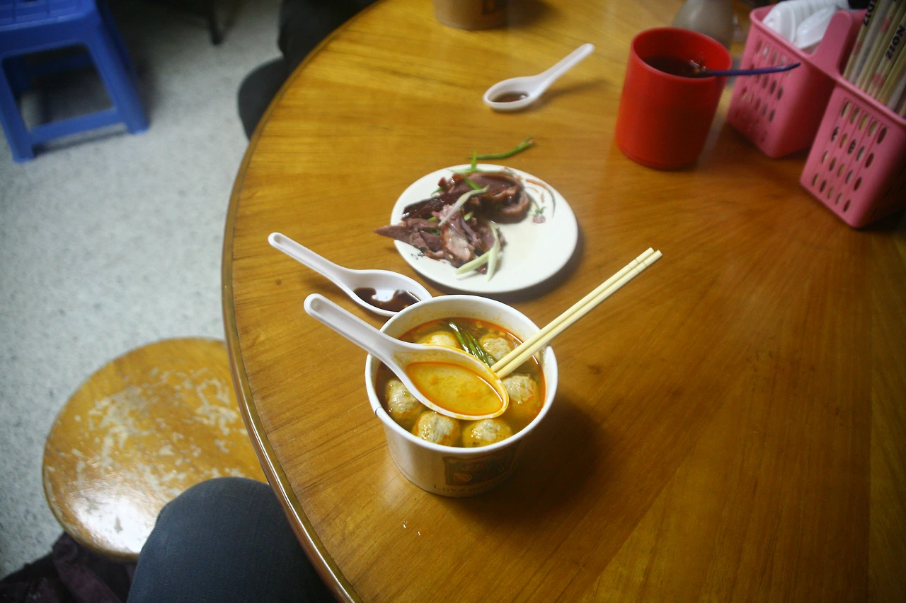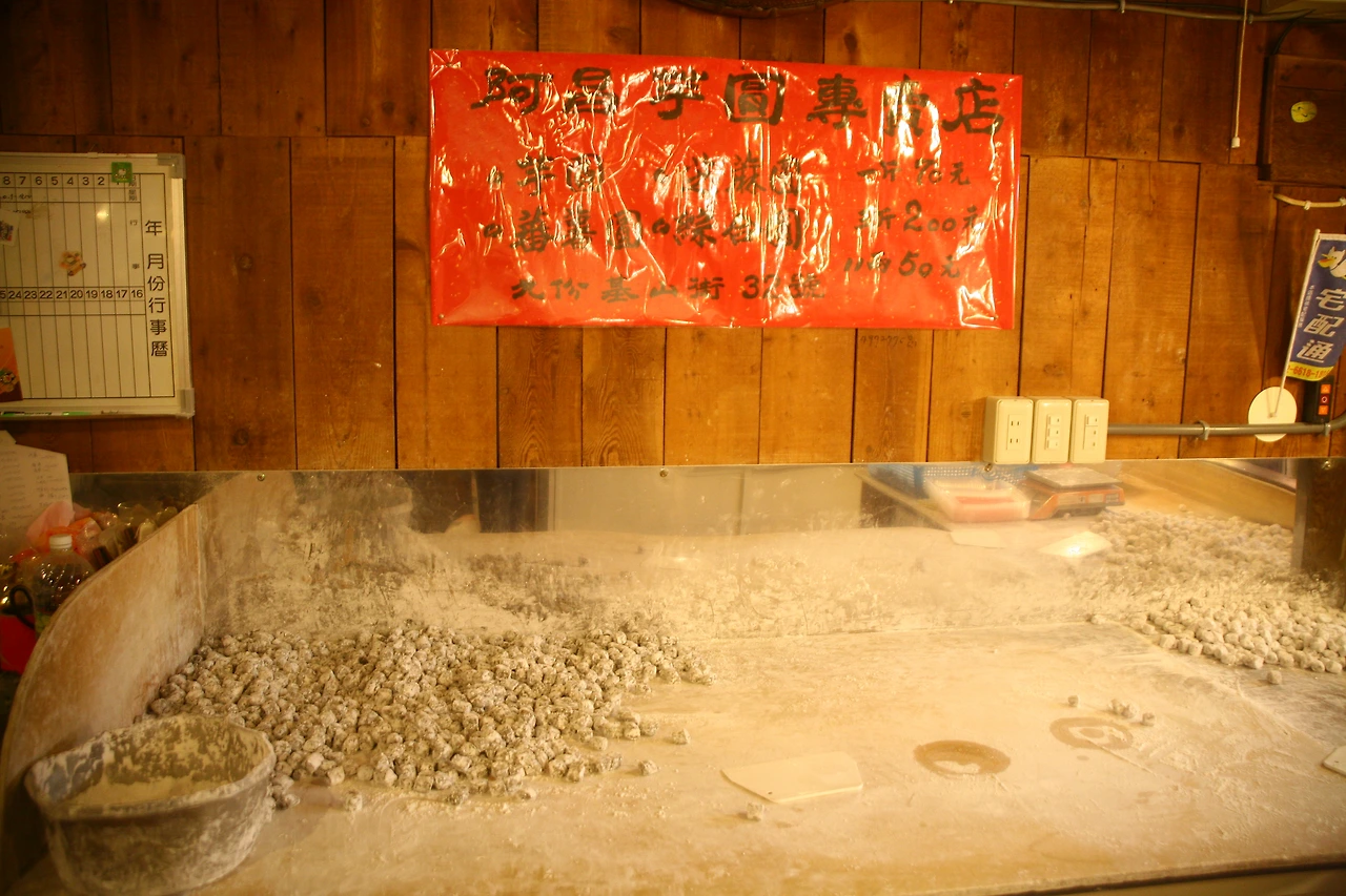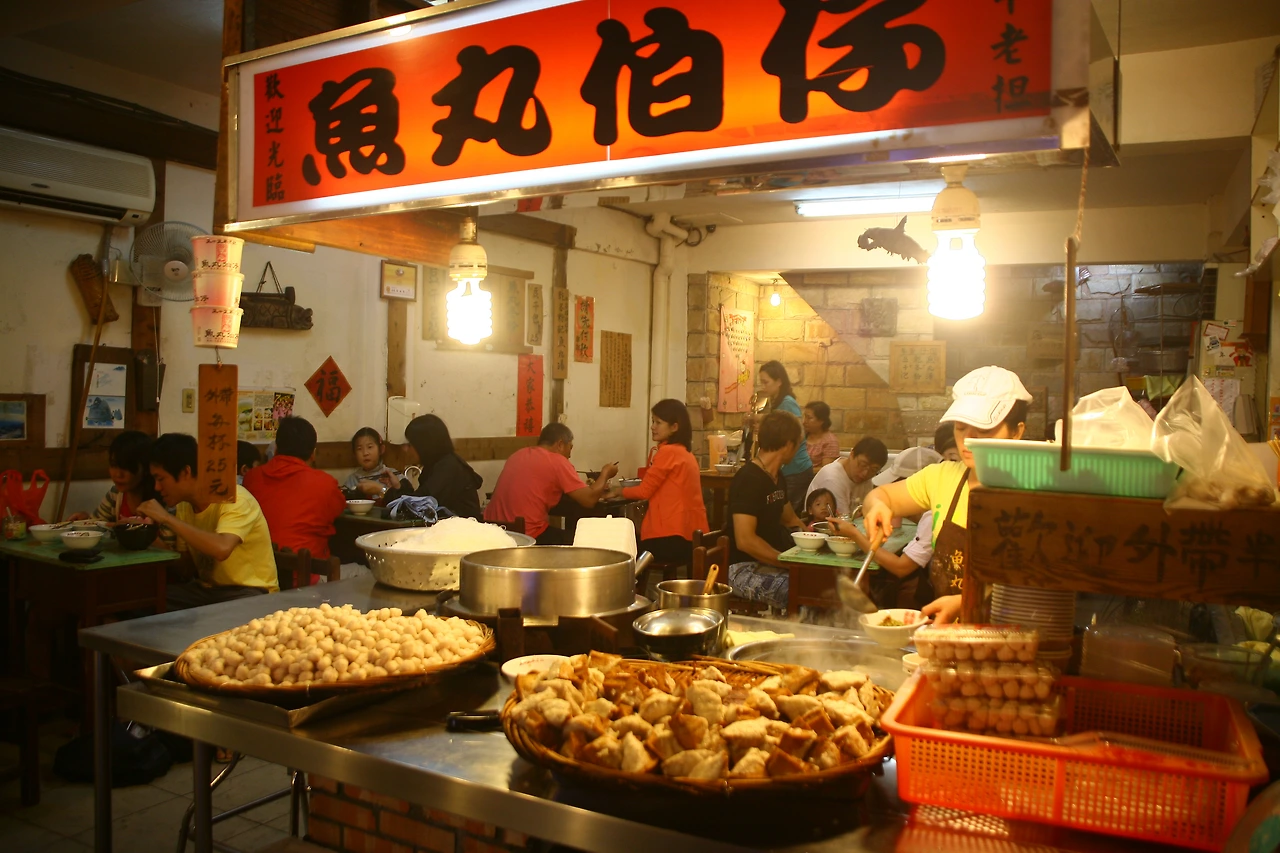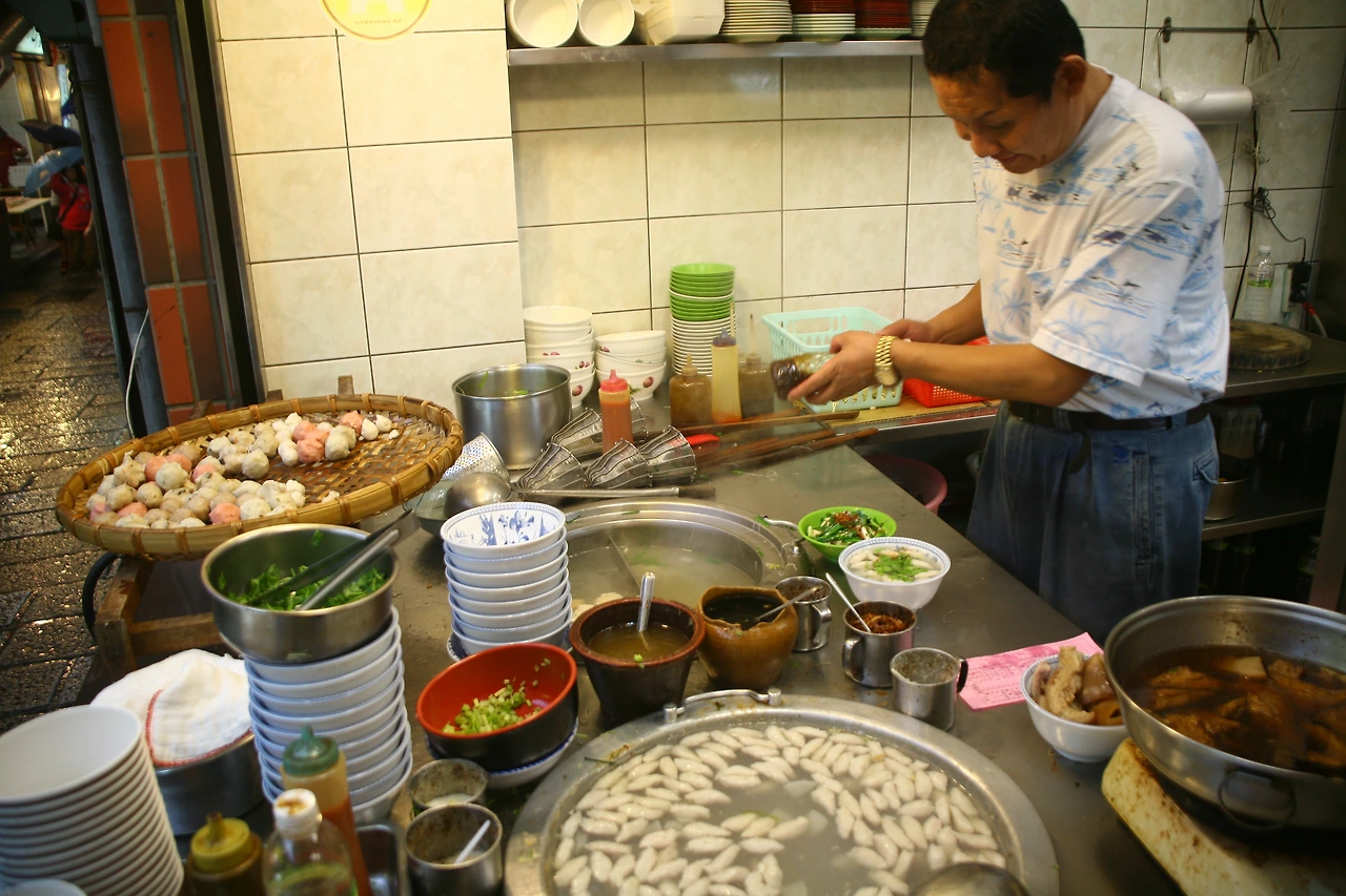 골목의 초입을 버티고 있는 길거리 음식의 시작점은 60년 전통을 자랑하는 어묵탕 가게인 ‘위완 보어 자이(어환 백자)’이다. 이곳은 쌀쌀하게 비가 오는 날이면 많은 사람들로 북적이는데 하얗게 올라오는 국물의 연기가 마치 ‘센과 치이로’의 한 장면을 연상시킨다. 담백한 국물에 탱탱하고 쫄깃한 어묵이 그만이다.