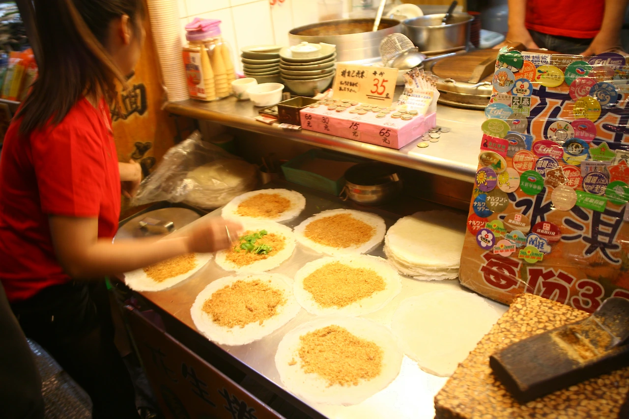 소시지에 정신이 팔려 있다 보면 어느덧 지우펀의 제일 명물이라고 할 수 있는 ‘화성 쥐안 커빙 치린’의 크레페 가게에 다다른다. 종이처럼 얇은 전병 위에 대패로 간 땅콩가루와 아이스크림을 넣고 돌돌 말아 크레페로 만들어 주는데 달콤한 땅콩가루와 아이스크림이 어울려 제법 맛있다.