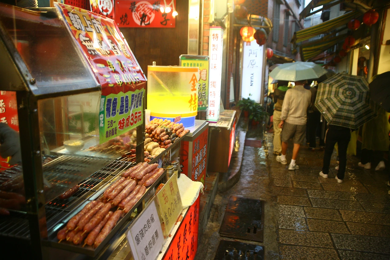 ‘센과 치히로의 행방불명’에 배경이 된 지우펀은 오래전 진과스 광산사업으로 사람들이 몰려들기 시작하면서 자연스레 주거지가 형성되었고 산이 많은 지역이라 산골짜기를 타고 다닥다닥 집들이 붙어있게 되면서 지금의 특별한 풍경이 만들어졌다. 영화 ‘비정성시’의 무대로도 잘 알려진 지우펀의 기다란 골목길은 처음부터 꼭대기 끝까지 다양한 길거리 음식들로 꽉꽉 들어차 있다. 해가 떨어지고 골목길에 홍등이 하나둘씩 불을 밝힐 때면 놀라운 길거리 음식들이 관광객들을 유혹하기 시작한다.