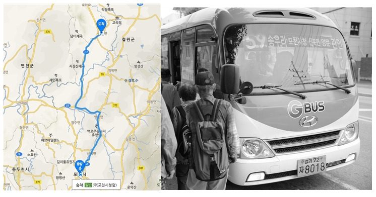 포천시 소흘읍에서 출발하는 일반 59번 시내버스는 포천에서도 다소 시골이라고 할 수 있는 관인면까지 운행하는 버스다. 하루에 운행 횟수도 적고 사람들이 많이 이용하는 버스가 아니기 때문에 버스의 크기가 그다지 크지 않다. 아침시간에는 배차시간이 짧다고는 하지만 도시의 시내버스와는 비교 자체가 불가해서 한참을 기다린 후에야 간신히 버스에 오를 수가 있었다.