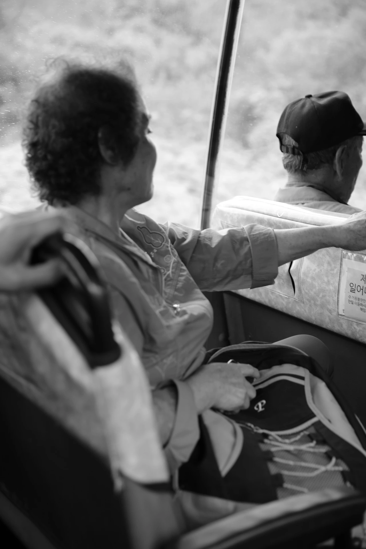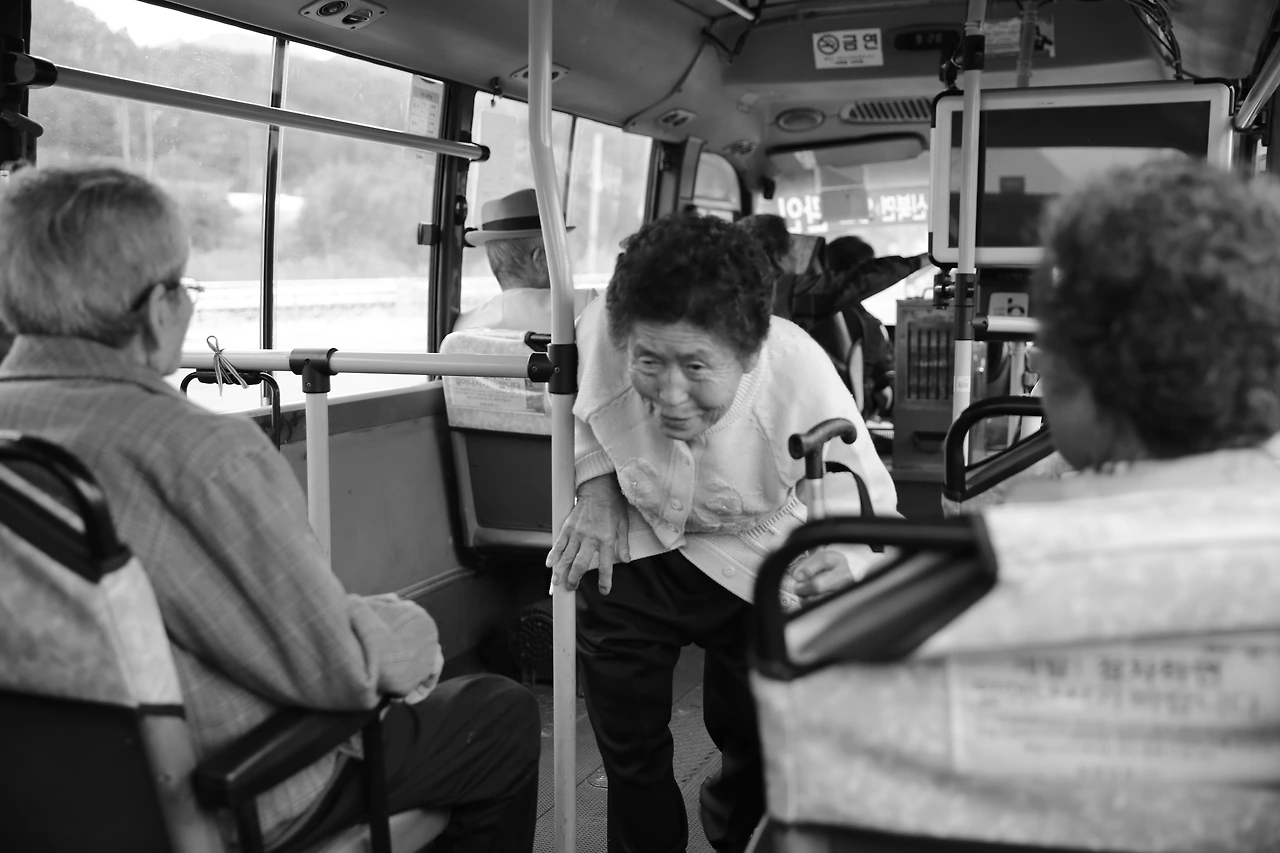 “겁나슈? 우린 나이가 먹어서 움직이기가 좀 굼뜨는데, 이 버스는 맨날 이렇게 빨리 달려, 허허”