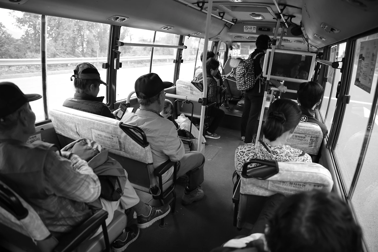 그런데 생각보다 많은 사람들이 줄지어 차에 오른다. 승객들 중 근처 학교로 등교하는 동네 아이들과 특히 나이가 지긋하신 어르신들이 눈에 많이 띄었다. 궁금해서 어르신께 물어보니, 가는 날이 장 날이라고 오늘이 마침 군 보건소에서 무료 독감백신을 접종해주는 날이라고 해서 모두들 한꺼번에 나오셨다고 한다. 시내버스가 마치 동네 경로당이 된 것 같은 북적북적한 분위기였다. 여기저기서 오랜만에 만나는 어르신들이 건네는 반가운 인사와 그동안 궁금했던 질문들이 깨알같이 쏟아져 나온다. 매일 같은 지역을 다니고 같은 승객들이 부대끼며 만나는 이 버스는 말 그대로 공동체 그 자체였다. 승객들이 부산하게 인사를 나누는 사이 버스는 포천시청을 떠나 곧바로 북쪽으로 이동해 신평리를 거쳐 백로주 유원지를 지난다.