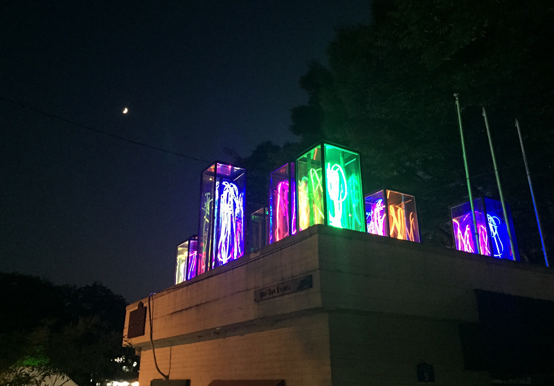 먼저 향교리 마을회관 옥상에 설치된 진시영 작가의 작품인 '향교리 대숲 속 빛의 하모니'는 950×660㎝의 공간에 10개의 유리 직육면체 구조물의 높이를 다양하게 설치한 작품으로 유리큐브 구조물 안에 LED로 대나무 형상을 상징적으로 표현하고 있다. 이 작품은 해가 지고 나면 더욱 빛을 발하는데 많은 박람회 관객들이 이 작품을 감상하며 여유롭게 휴식을 취하고 있었다.