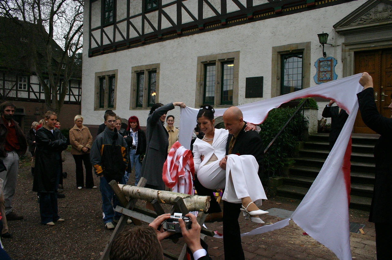보덴 베르더 시내를 걸으며 이런저런 상상을 하다가 시청사 앞에 있는 허리 잘린 그의 말 동상에서 나오는 약수 물을 마시고 있을 때 우린 거기서 운 좋게 독일식 전통 결혼식을 맞닥뜨리게 되었다. 우리가 본 풍경은 독일의 일반적인 결혼식 중 결혼신고를 하고 일가친척들과 친구들에게 그 사실을 알리는 결혼식 두 번째 날의 행사였다. 독일의 결혼식은 보통 세 단계로 나뉘어 3일 동안 진행되는데 첫째 날은 폴터 아벤트(Polter Abend)라고 해서 결혼식 전날에 열리는 파티이고 둘째 날은 결혼 등록소에 가서 결혼식을 올리는데 우리가 본 것이 바로 이 장면이었다.