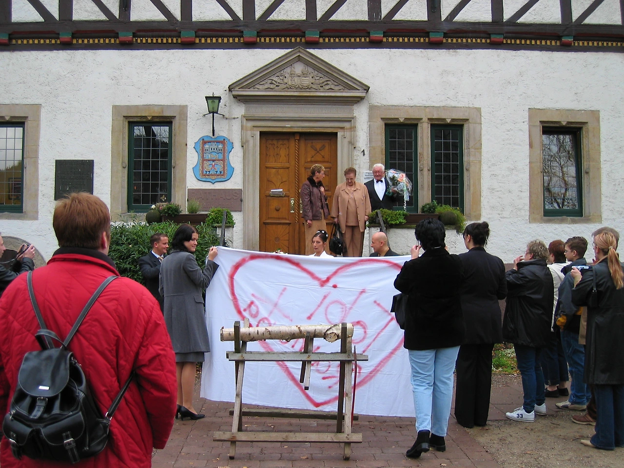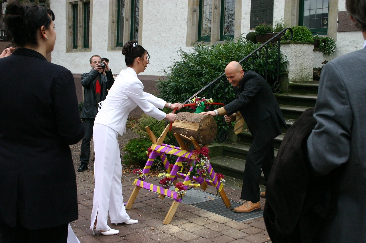 보덴 베르더의 시청사에서 혼인신고를 마친 신랑과 신부는 밖에서 미리 대기하고 있던 가족과 친구들의 환영을 받는데 특이한 점은 그것이 무척 간소하다는 것이다. 음식이나 술은 아예 준비된 게 없고 아주 간단하게 나무토막을 서로 합심해 큰 톱으로 자르고 하트가 그려진 천을 신랑이 신부를 안고 통과하는 이벤트만이 있을 뿐이다. 형식이 간단하다고 사랑도 작아질까? 그런 건 절대 아니다. 형식이 요란하다고 사랑도 배가 되는 건 아니니까. 그 결혼식은 우리에게도 재밌는 경험이었지만 그들에게도 캠핑카 타고 날라 온 나 같은 코리언이 진심으로 축하해 주었으니 아마도 뜻깊은 결혼식이 되지 않았을까.