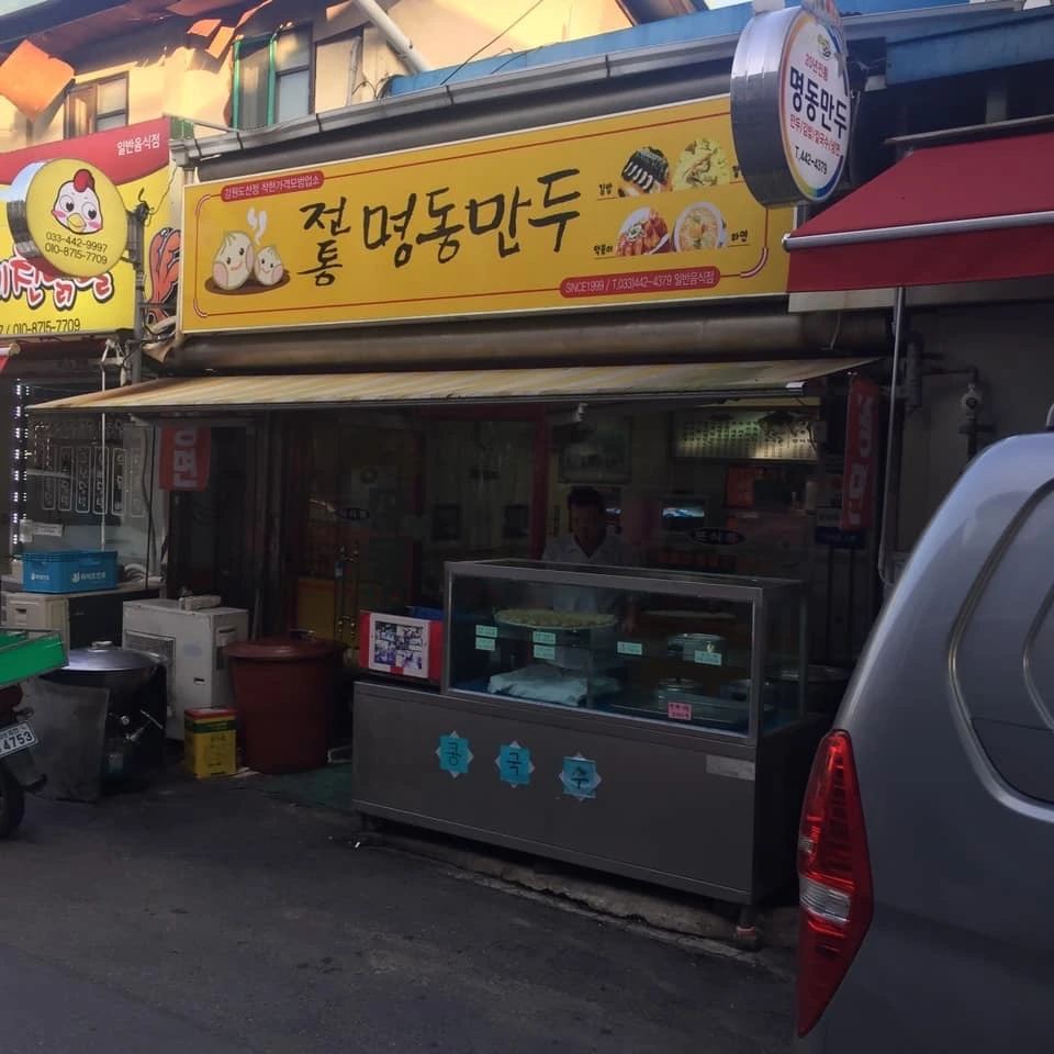 그런 추억을 까맣게 잊고 있었다가 터미널 근처 화천시장의 조그만 분식집에서 그만 추억이 터져 버렸다. 화천시장 내 전통 명동 만두라는 작은 분식집은 얼핏 보면 일반적인 식당처럼 보이지만 역사가 무려 20년이 넘는 분식 노포다. 한 가지 음식을 고집하지 못하는 분식집이 강산이 두 번 바뀔 때까지 버틴다는 건 쉬운 일이 아니다.