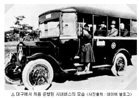 기왕 말이 나온 김에 조금 더 부언하면, 우리나라에서 시내버스가 처음 운행된 곳은 서울이 아닌 대구였다. 우리나라의 첫 시내버스는 1920년 7월 1일 경상북도 대구부에서 국내 최초로 운행되었다. 당시 대구 호텔 주인이었던 ‘베이무라 다마치로’라는 일본인이 버스 4대를 들여와 대구에서 시내버스 영업을 처음으로 시작했다. 이 버스는 전차와 달리 정류장이 아닌 곳에서도 누구나 손을 들면 태워줬기 때문에 인기가 많았다고 한다. 하지만 전차보다 비싼 7전이란 요금 때문에 시민들이 외면했고 결국 버스 운영권이 경성전기 주식회사로 넘어간다.