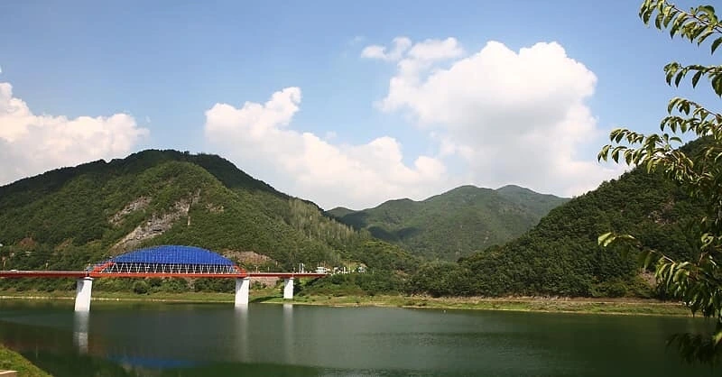단양 시외버스터미널에 내리자마자 앞으로 보이는 풍경은 아름다운 남한강과 산에 둘러싸인 고수대교의 웅장한 자태다. 고수대교는 단양읍을 가로지르는 남한강에 위치한 교량으로 단양읍 도전리와 고수리를 연결해준다. 이 다리를 건너면 고수리로 연결되어 고수동굴 등 단양의 여러 문화유적지를 만날 수 있다.