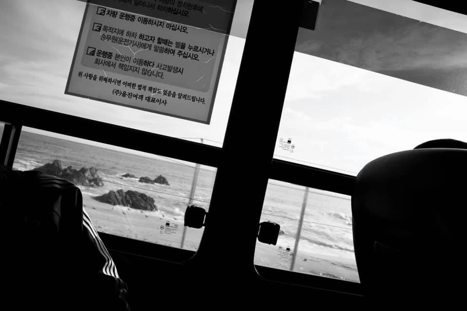 이른 아침 평해행 첫차를 탄다. 그런데 완행이라는데 좌석이다. 심지어 차종이 현대산 2012년형 뉴-슈퍼 에어로시티 버스다. 완행 아니잖아, 게다가 스피드가 장난 아니다. 7번 국도 배틀 수준이다. 왕피천을 시작으로 망양정해변, 산포/진복/오산/망향/기성/척산/봉산/구산까지 해안가를 버스가 신나게 질주한다.