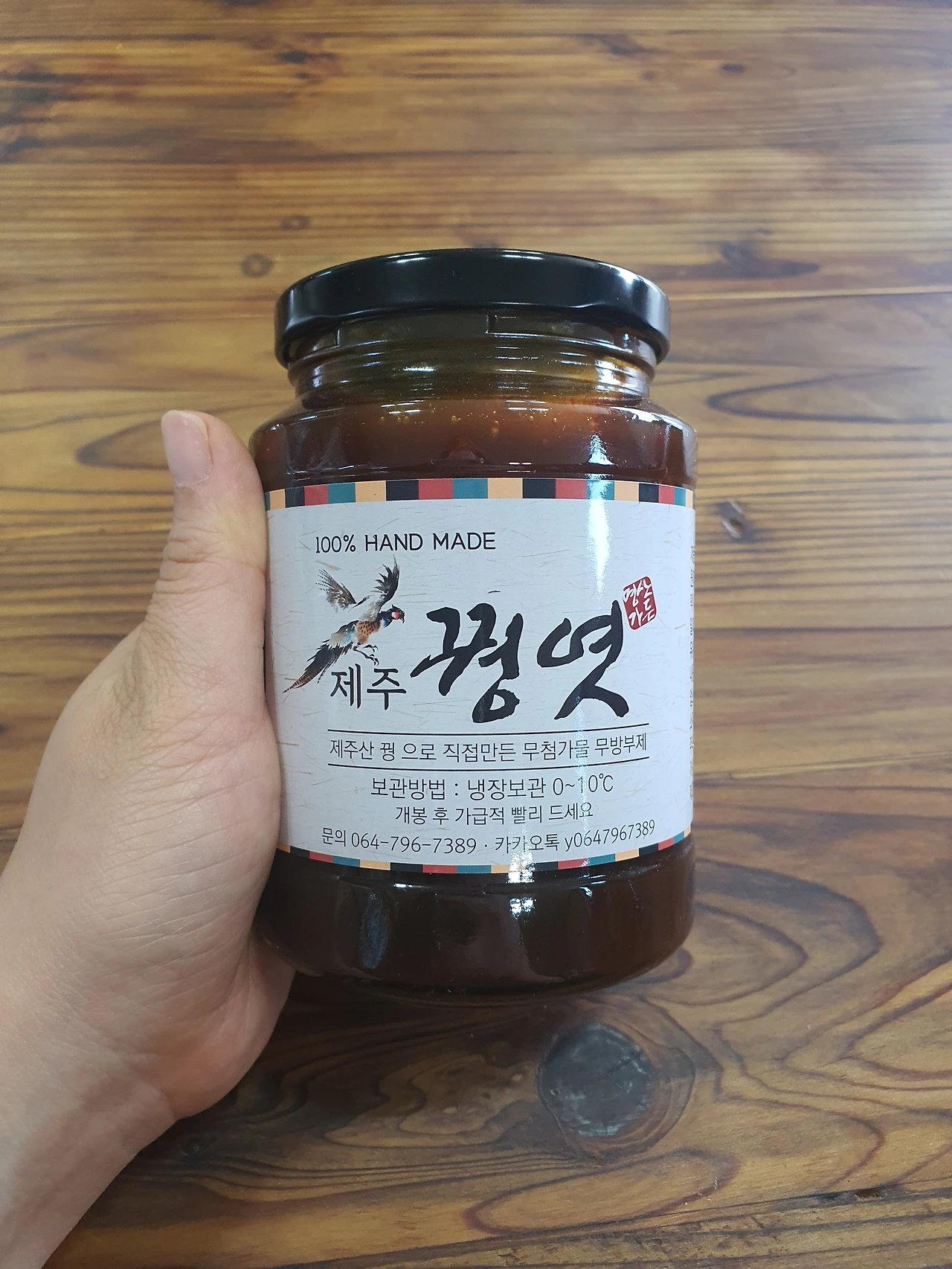 앞서 언급했듯이 우선 제사상에 올리는 용도로도 사용이 되었다. 그다음으로 그 꿩을 푹 고아서 꿩엿과 꿩메밀국수를 만들어 먹었다. 제주의 엿은 육지부의 엿과는 그 모양과 기능에서 확연히 차이가 있다. 일단 육지부의 엿이 디저트 개념의 캔디류에 가까운 한과라고 할 수 있다. 다 고아진 조청을 상온에서 여러 번 늘리고 접는 과정을 반복해서 고체화시키는 것이다. 하지만 제주의 엿은 이러한 과정을 거치지 않는다. 차조밥에 엿기름을 넣어 삭힌 것에 꿩 삶은 물을 넣고 어느 정도 걸쭉해질 정도로만 고아낸다, 즉 조청의 농도보다 조금 더 고아내는 정도로 그치면 숟가락으로 떠먹는 조청과 엿의 중간 그 어디쯤의 제주의 꿩엿이 만들어지는 것이다.