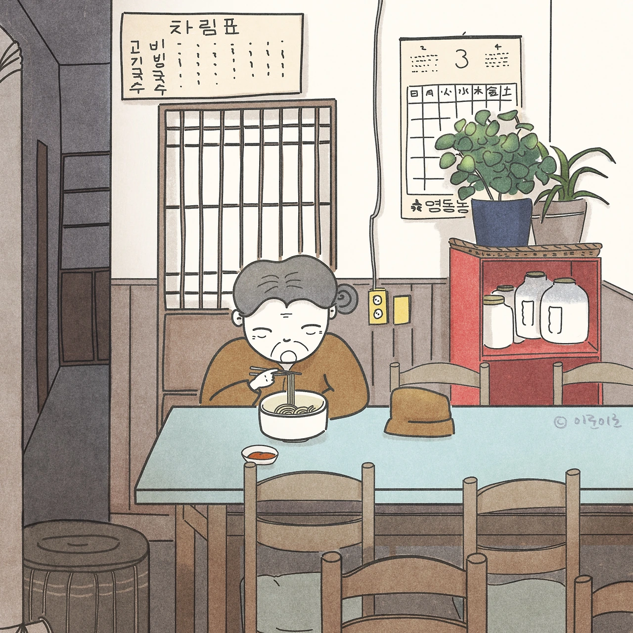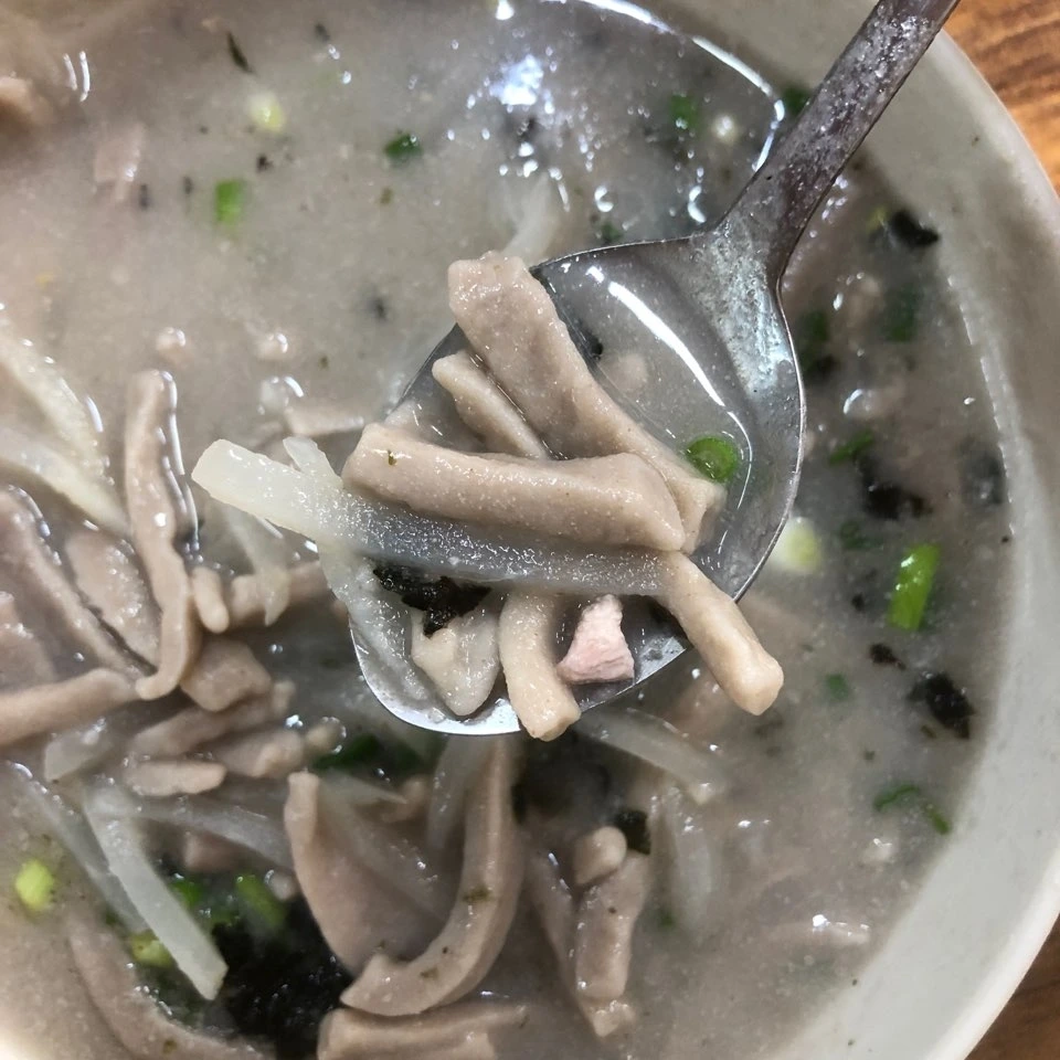언젠가 제주 전통시장 골목을 걸어가고 있을 때였다. 나도 모르게 한 식당 앞에서 발걸음이 멈췄다. 그 식당 안에는 관광객이 아닌 제주 토박이로 보이는 중·장년층들이 빼곡히 들어앉아 모두 한 그릇씩의 국수를 마주하고 있었다. 그런데, 그 면은 다른 국숫집의 국수 하고는 많이 달라 보였다. 면뿐 아니라 육수의 색깔 또한 제주에 흔한 다른 국숫집의 국수들, 이를테면 고기국수나 멸치국수, 보말칼국수 등등과도 달라 보였다. 나는 식당을 나오는 할머니께 여쭤보았다.