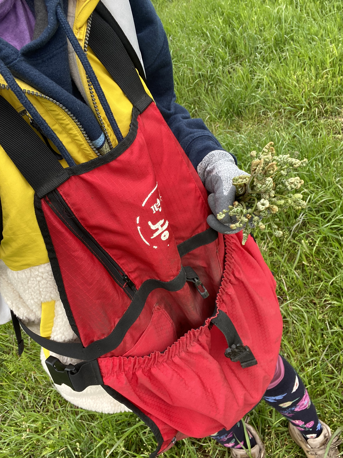 고사리를 충분히 담을 수 있는 가벼운 배낭과 고사리 앞치마는 필수이다. 고사리를 꺾고 어느 정도 고사리 다발이 한 손에 만들어졌다면 고사리 앞치마나 가방에 담는다. 고사리 앞치마 하단 부분에는 지퍼가 달려있어 아래 지퍼를 열어 한 번에 쉽게 가방으로 옮길 수 있다(물론 이 고사리 앞치마는 고사리를 꺾기 위한 용도로만 쓰이지는 않는다. 곧 다가올 매실철에도 두고두고 유용한 앞치마가 된다.).