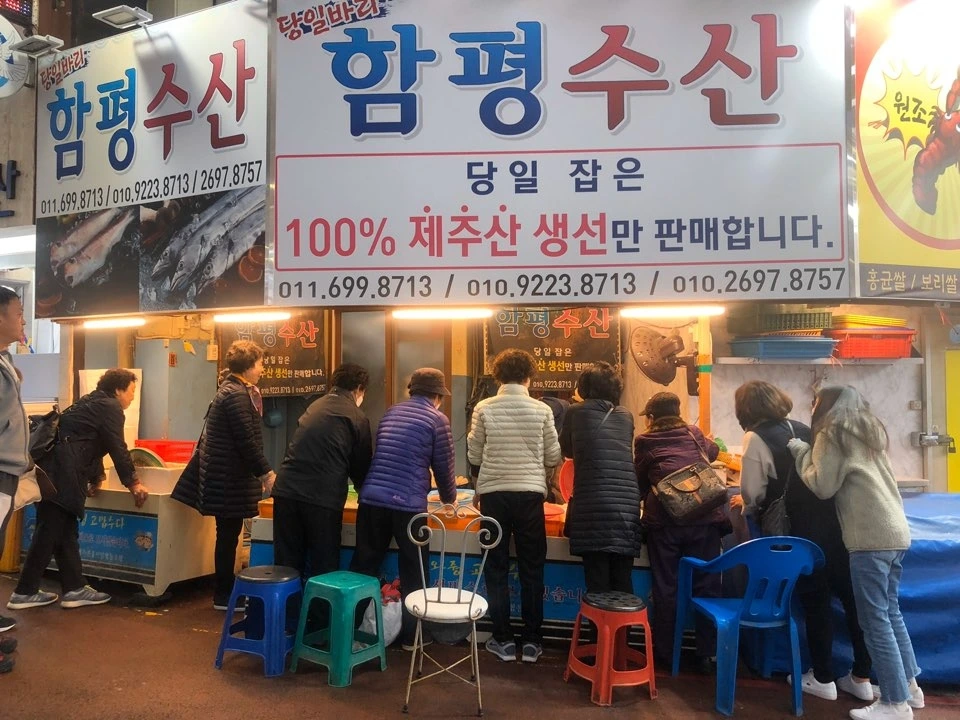 이번에는 서귀포 올레시장으로 가볼까 한다. 35여년 넘게 그 자리를 지켰다는 함평수산에 무언가 특별한 이벤트가 기다리고 있다. 낮 12시부터 마을 할망들이 삼삼오오 몰려든다. 그리고 한켠에 마련된 의자를 하나씩 들고 주인도 없는 어물전 앞에 자리를 잡고 앉는다. 1시가 되니 어르신들 몇 분이 더 왔다. 그리곤 늘 하던 것처럼 의자를 하나씩 빼들고 와서 착석한다. 30분 정도가 지나니 주인도 없는 어물전 안으로 서슴없이 들어가 각자의 소쿠리를 하나씩 챙기고 비닐장갑도 손에 끼는 걸 보니 이제 곧 이벤트가 시작 될 성 싶다.