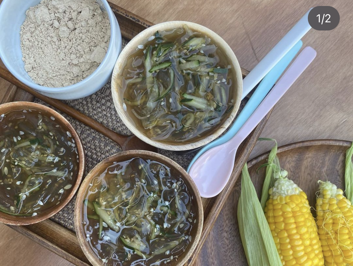 더운 여름, 밥도 넘기기 여간 쉽지 않을 때 할머니들은 이 우미냉국을 식사대용으로 많이 드셨대요. 그러고보니 칼로리가 거의 없는 우미와 고소한 볶은 콩가루, 부추, 오이 정도만 들어가니 영양식 겸 다이어트를 하는 분들께도 정말 좋은 음식이겠어요.