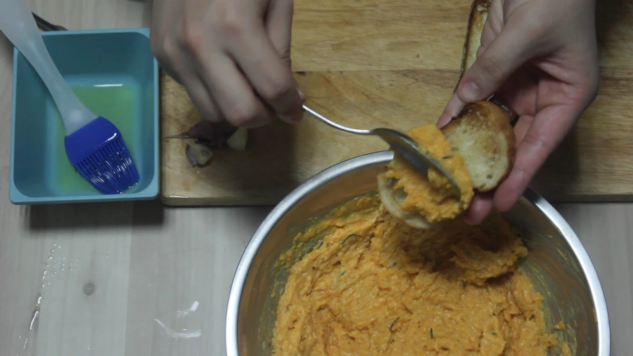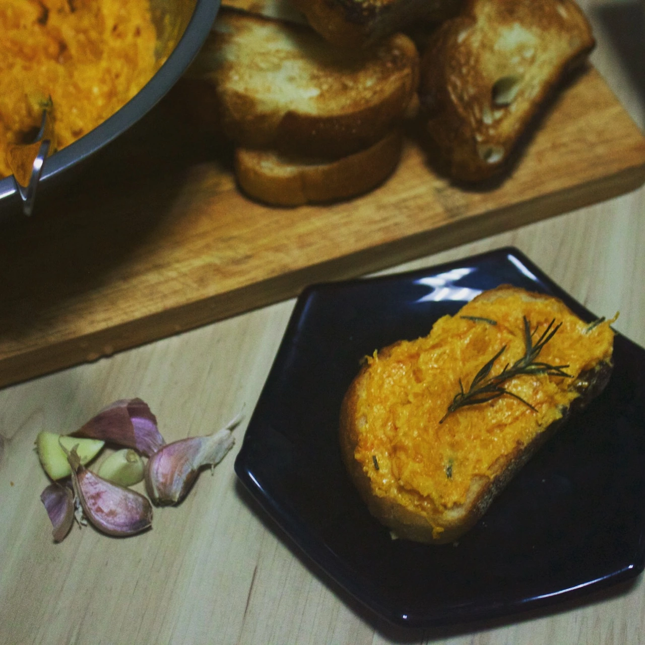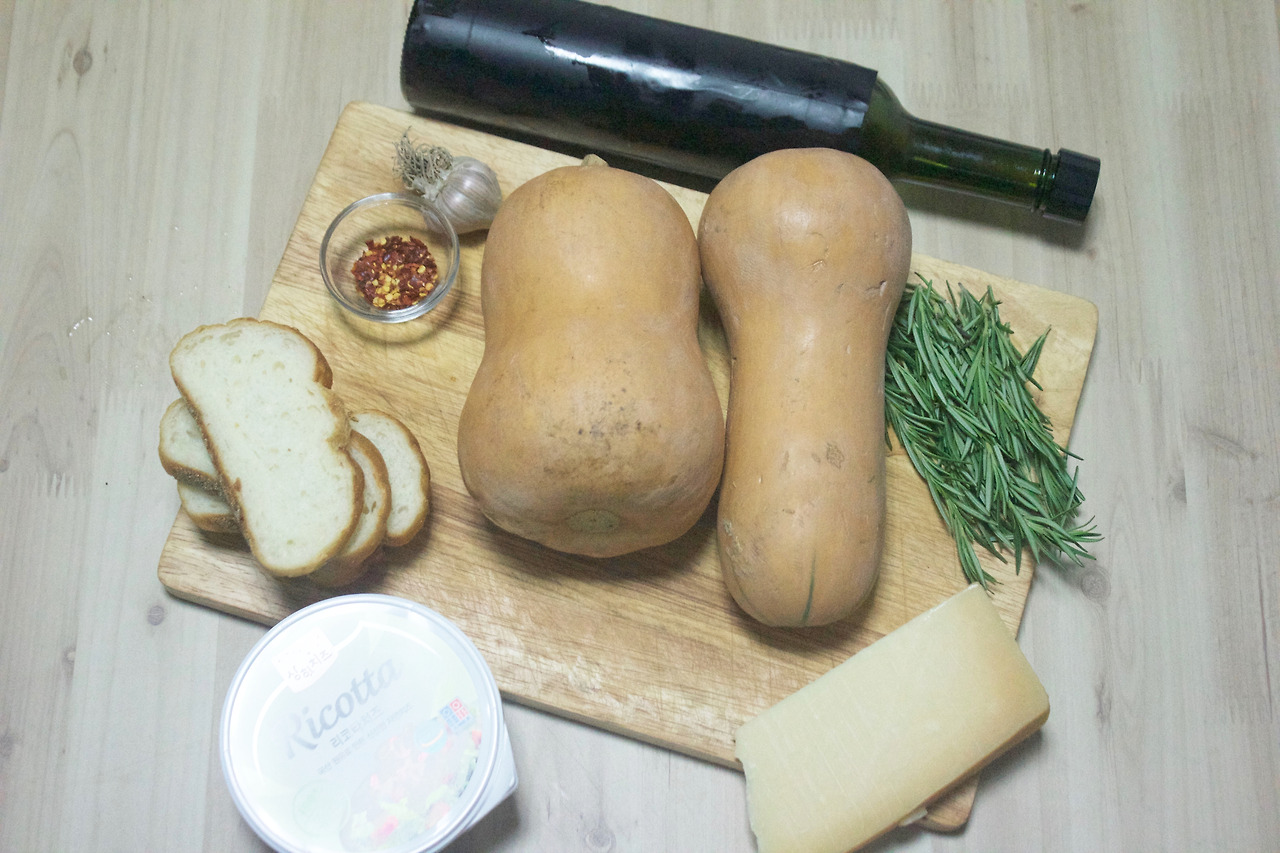빵 위에 올리는 토핑은 굉장히 다양한 편입니다. 프로슈토같은 햄류를 올리는 경우도 있고, 구운 버섯이나 채소, 치즈 등을 자유롭게 조합해서 올리기도 하죠. 저는 '크리스마스 레시피'라는 컨셉에 맞춰서, 먹는 이의 입속을 특유의 달콤함과 고소함, 그리고 따뜻함으로 채워줄 땅콩호박을 이용한 토핑을 만들어 보았습니다.
