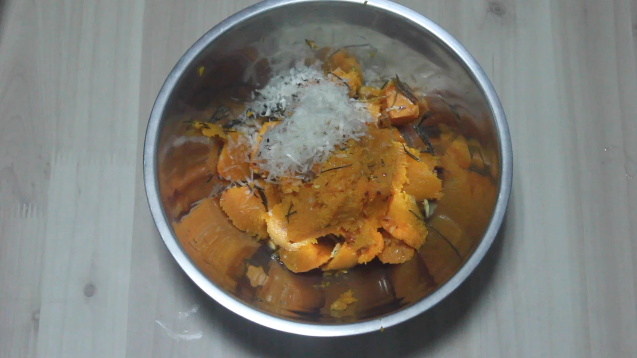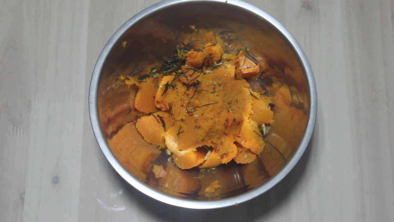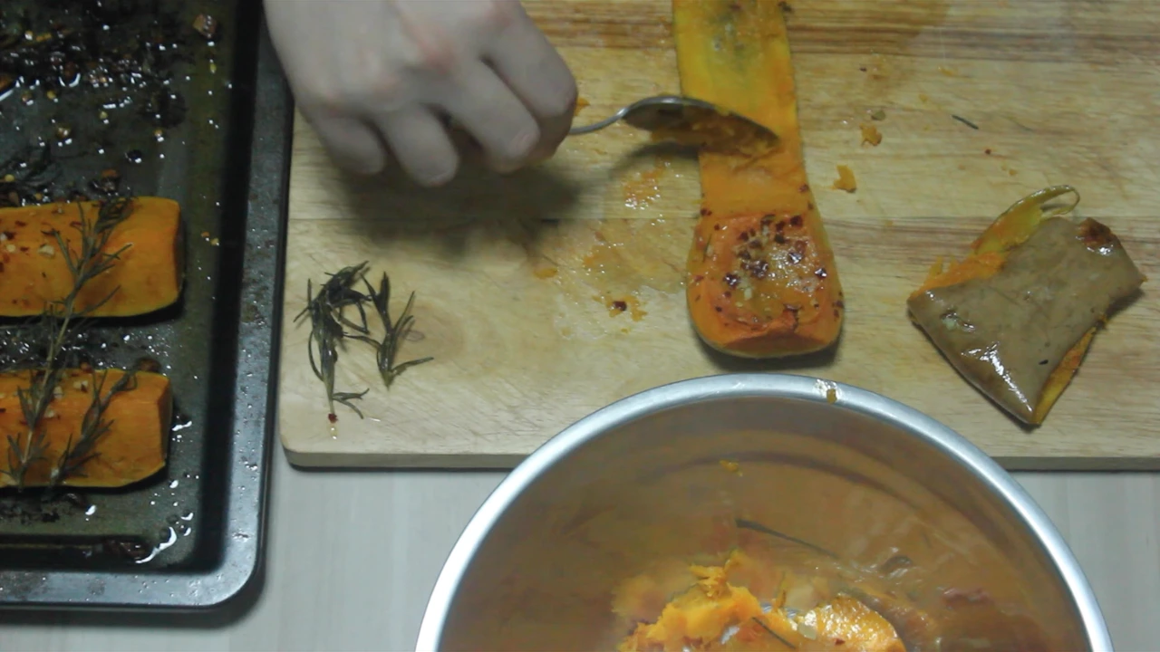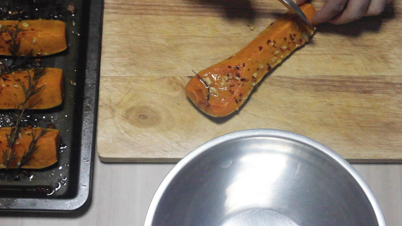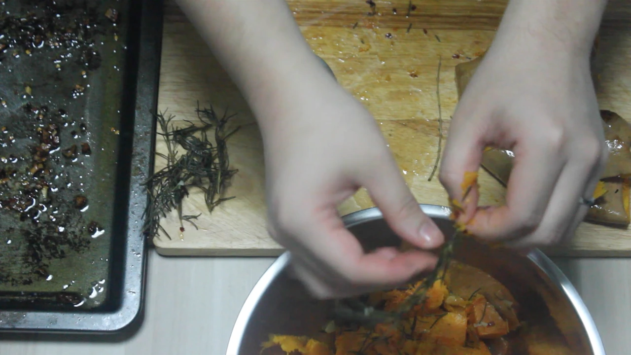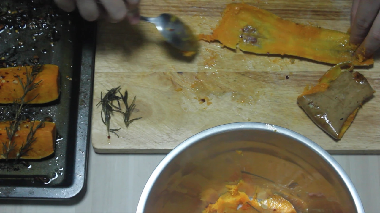땅콩 호박과 같이 구워진 로즈마리 잎사귀도 긁어서 넣어주시고, 트레이 바닥에 자작하게 깔린 올리브 오일은 마늘, 로즈마리, 호박 등의 향을 간직하고 있는 엄청난 재료가 되었을테니, 조심스레 트레이를 기울여서 발라낸 호박에 쪼르르 부어주세요.