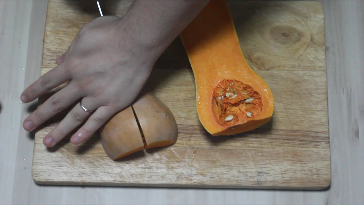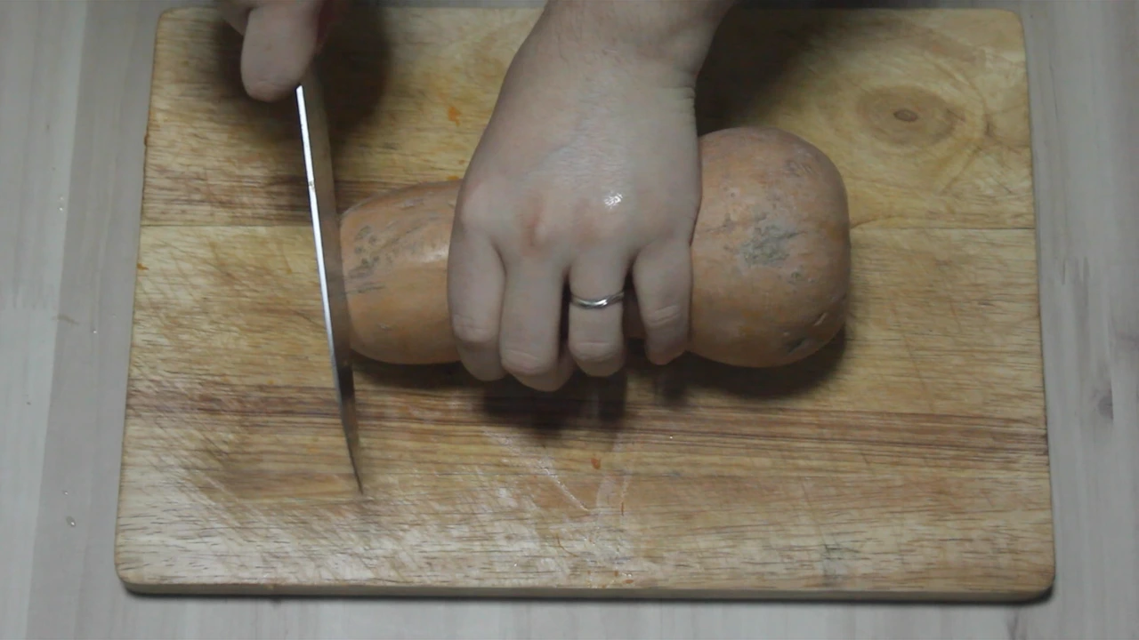 땅콩호박은 껍질이 단호박만큼 단단하지는 않지만 그렇다고 두부마냥 연한것도 아닙니다. 그러니 손질 과정에서 꼭 손을 조심해 주시고, 칼을 잡지 않은 손으로 호박을 꽉 붙잡아주세요.