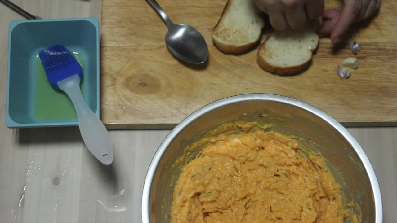 빵이 준비되었으면 브루스케타의 가장 큰 특징인 마늘향을 입혀주실 차례인데요. 사진에서 잘 보이지는 않지만, 생마늘을 반으로 잘라, 자른 단면을 빵 표면에 문질러 주시면 끝입니다. 매우 간단하지만 아마 깜짝 놀라실거에요. 정말 '마늘향'이 생생하고 강렬하게 나거든요.