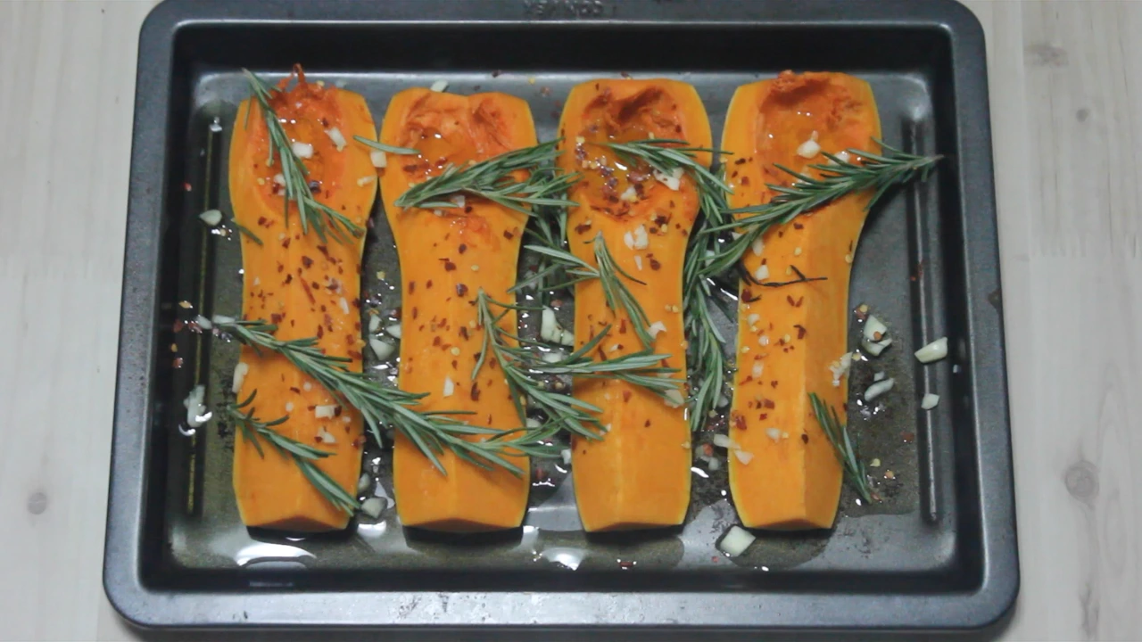 씨 까지 정리된 땅콩호박의 속살이 위로 가도록 가지런히 오븐 트레이(오븐 철판?)에 올려주시구요, 그 위에 올리브 오일을 골고루 뿌려주세요. 양을 계량하여 넣지는 않아서 잘 모르겠지만 2~3 테이블 스푼 정도 뿌린 것 같네요.올리브 오일 뒤에는 준비된 다진 마늘, 매운 고추 빻은 것, 로즈마리를 잘 퍼트려서 놓고, 소금, 후추간도 해주시겠습니다.