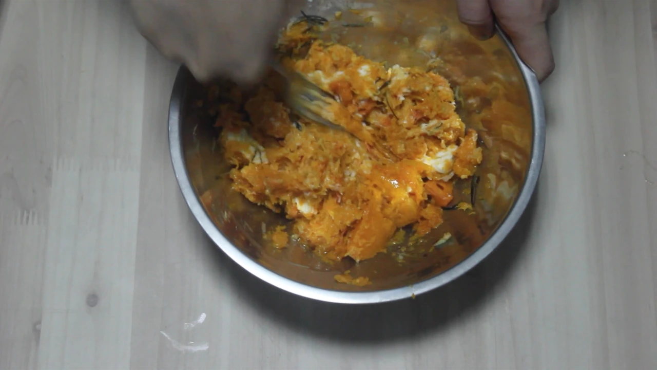 마지막으로 재료들을 포크로 으깨가며 잘 섞어주시면 토핑은 완성입니다.