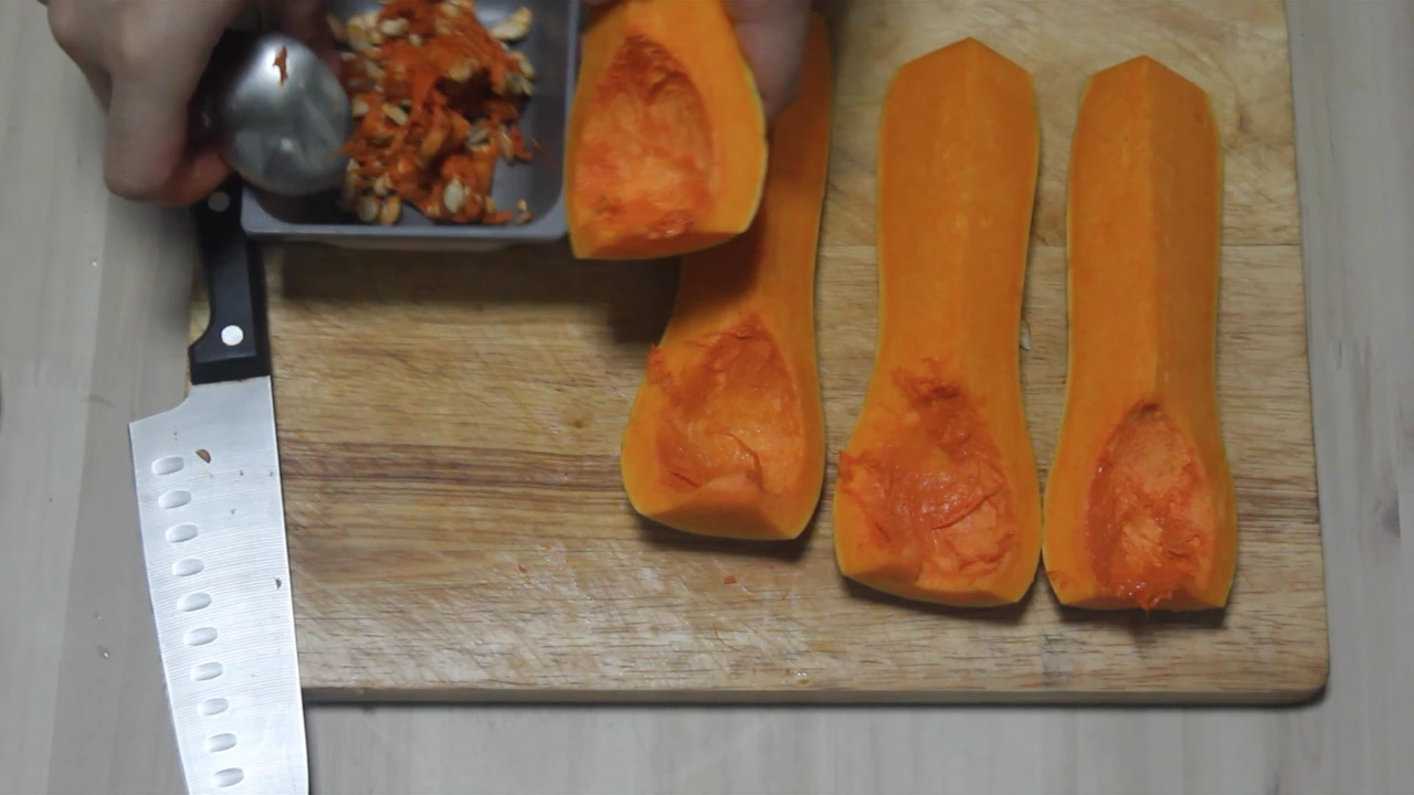 다음으로는 땅콩호박을 사진에서 보시는 것 처럼 4등분해주신 뒤, 숟가락으로 씨를 긁어냅니다. 생각보다 씨가 단단하게 붙어있는데요, 잘 떨어지지 않는 것은 약간 힘을 주어 뜯어낸다는 생각으로 하셔도 되겠네요.