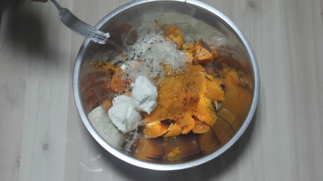준비했던 파마산, 리코타 치즈도 과감하게 넣어주세요. 재료 부분에서 말씀드렸다시피, 치즈의 양은 입맛에 맞게 사용하시는 것이 좋을 것 같습니다. 개인적으로 파마산을 1테이블 스푼 넣으니까 좀 싱거운 듯 했고, 리코타를 2테이블 스푼 넣었으니까 호박맛이 너무 강하게 났어요(솔직히 호박을 그렇~게 좋아하는 편은 아닙니다...)