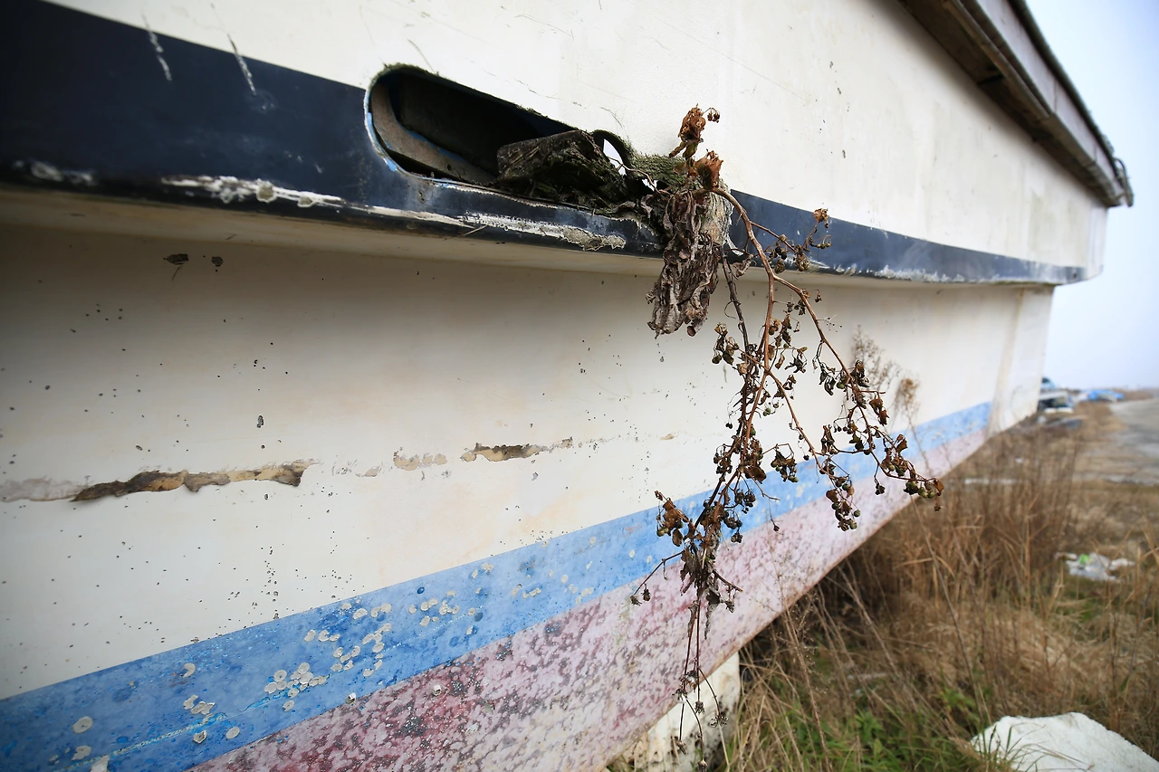 영화롭던 시절은 언제 적 일인지 모르게 지나갔고 곳곳에 폐그물과 쓰레기가 쌓여 악취를 내뿜고 있었다. 또 한 척의 배가 내 시선을 사로잡았다. 작은 어선보다는 제법 큰 규모의 배가 하늘 높이 뱃머리를 들고 있었다. 바다로 나아갈 수 없으니 이제 하늘로 날아가고 싶은 꿈을 꾸는 것일까. 특이하게도 배의 중간에 구멍이 뚫린 곳에서 아래로 늘어진 채 식물이 자라고 있었다. 썩어가는 나무토막에 뿌리를 내린 까마중과 노란 엉겅퀴였다.