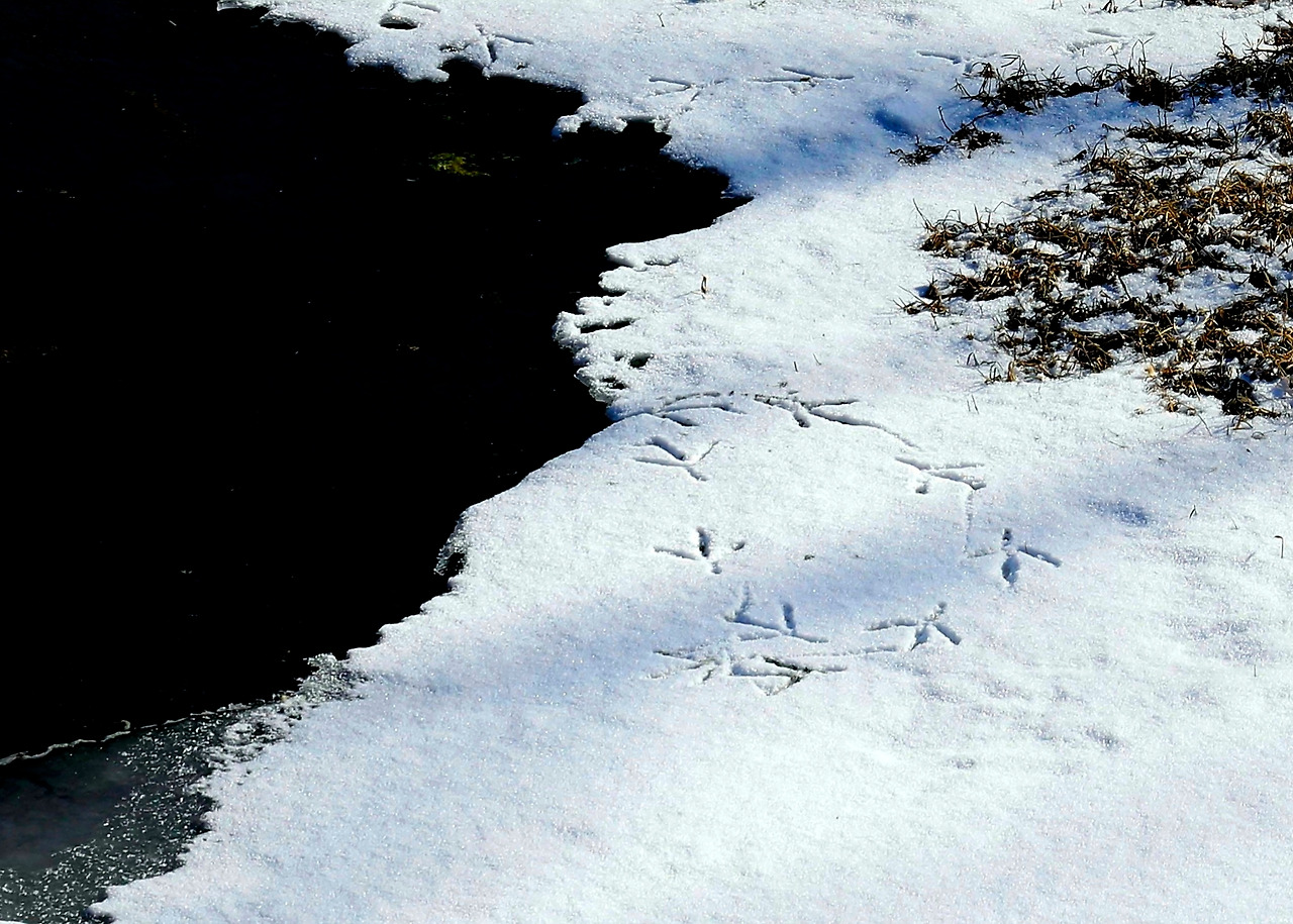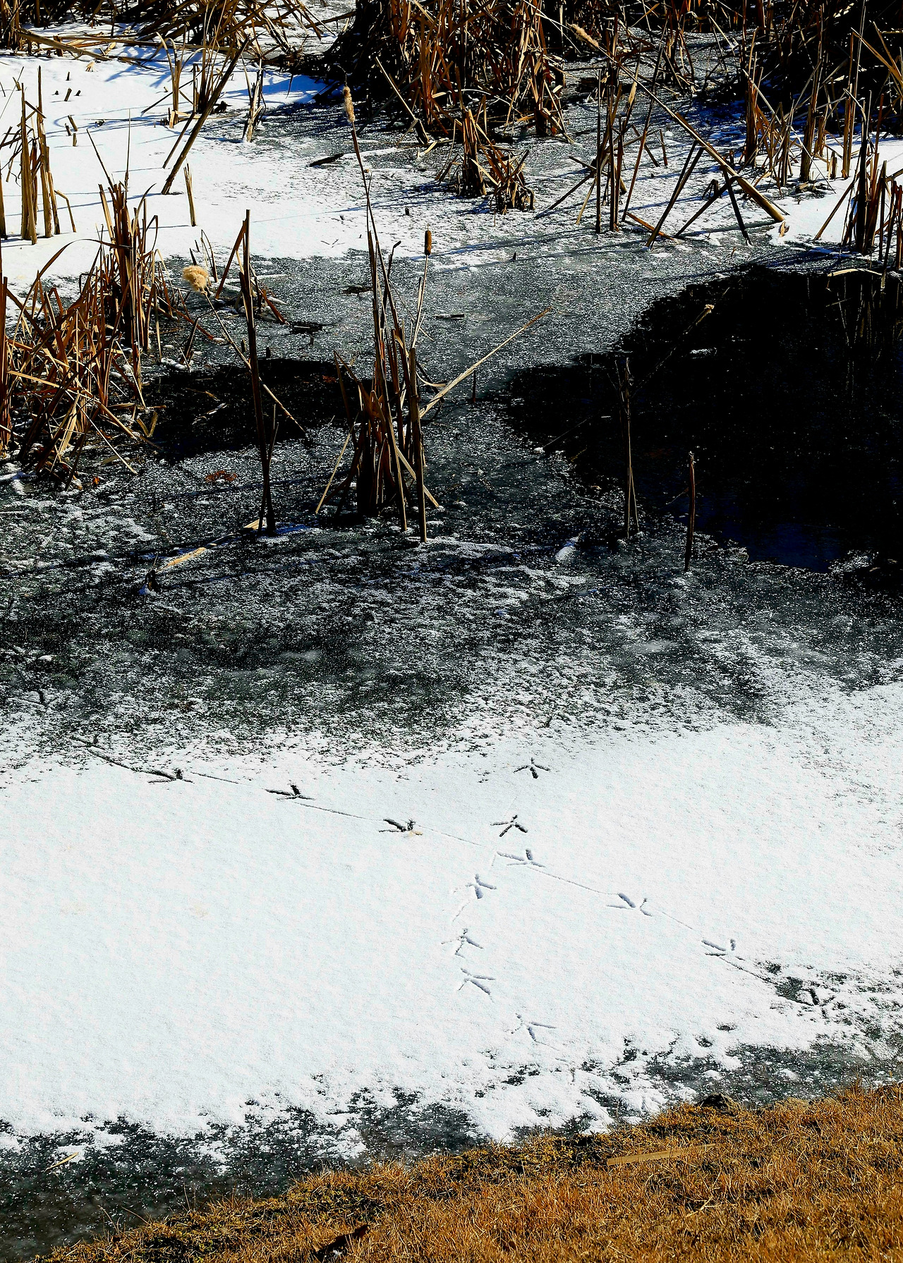 연못 한쪽은 아직 얼지 않은 곳이 남아 있어 발길을 옮겼다. 가장자리에 숫눈을 밟은 새의 발자국이 눈에 띄었다. 가까이에서 보니 발자국은 일정하지 않았다. 발자국의 크기로 보아 작은 새는 아니고 키가 큰 새 같았다. 두 다리로 걸었을 텐데 자국은 X처럼 겹치거나 한 발로 원을 그린 것처럼 둥근 모양이었다. 어디에서 왔는지는 모르지만 물 속의 먹이를 찾았던 흔적으로 보였다.