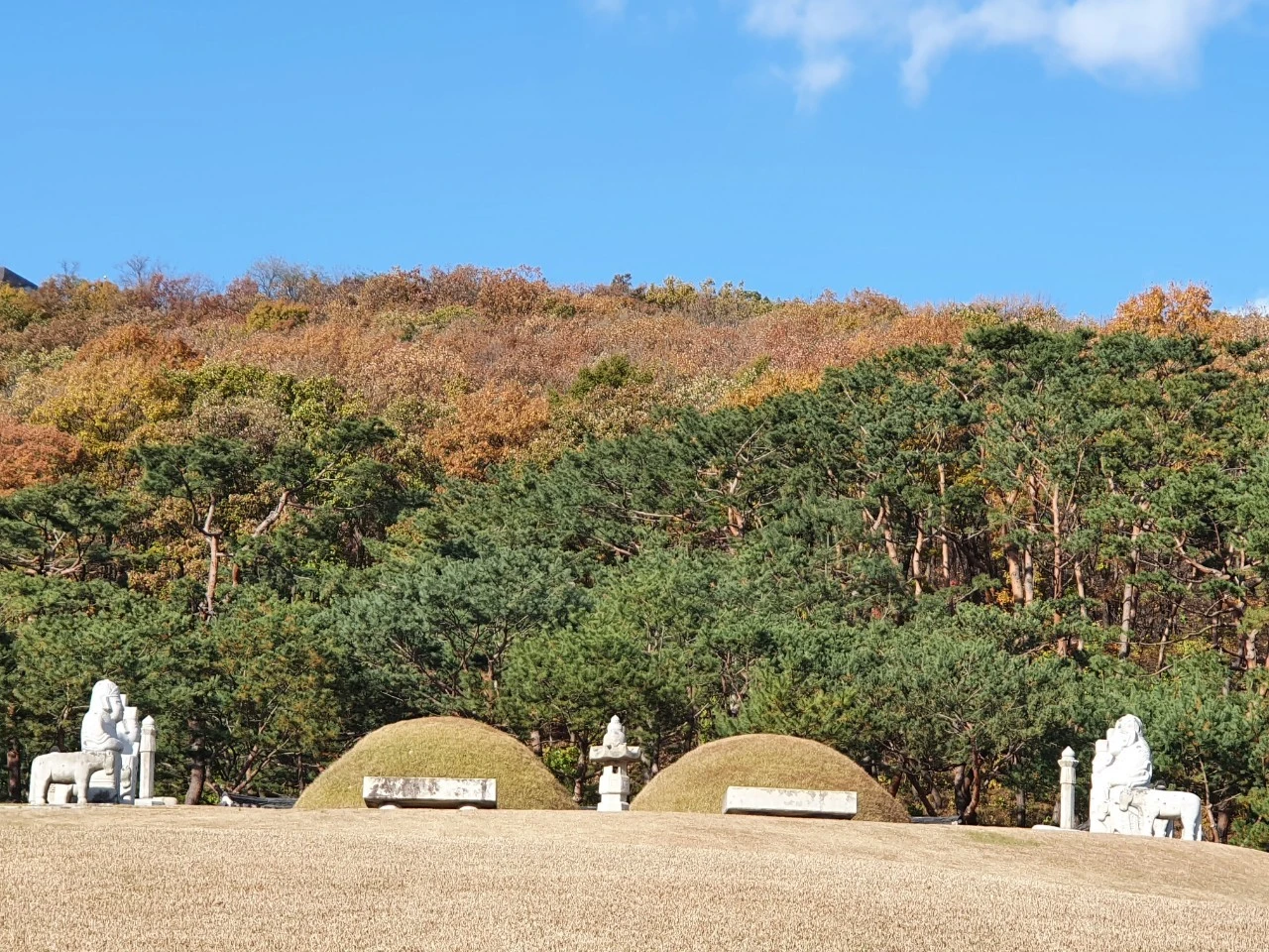 5분 정도 갈등하다가 결정했다. 카메라 챙겨서 장릉으로 가자. 집 밖을 나서는 순간 파란 하늘이 보이고 양편으로는 절정기에 오른 단풍들이 바람에 날리며 예쁨을 뽐내고 있다. 거기에 팽그르르 돌며 떨어지는 단풍잎(카메라에 담으려고 애를 썼지만 나보다 빠르네. 포기 ㅠ) 15분 걸어서 장릉에 도착했는데 평일인데도 주차장에 차가 가득하다. 역시 가을은 누구에게나 방구석을 나오도록 유혹하는 모양이다. 입장료가 1,000원이지만 늙음이 좋은 것은 민증만 보여주면 무료입장이다.
