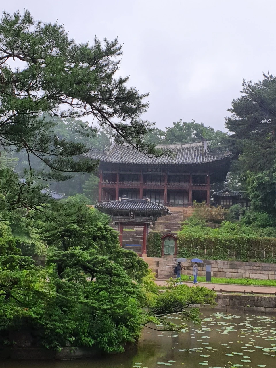 비 내리는 후원을 걸었어요. 그 넓은 공간에 사람을 만나기 어려울 정도로 인파가 없었기에 마치 자신이 왕이 된 것처럼 무게를 잡고 천천히 느린 걸음으로 산책을 했습니다. 우산을 받쳐줄 누군가 있으면 좋겠지만 혼자였답니다. ㅠ ㅠ