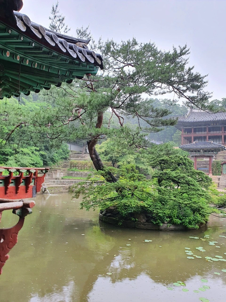 이 행복은 언덕을 넘으면 펼쳐지는 부용지((芙蓉池)를 보면서 감탄사로 바뀐답니다. 내리는 비 때문에 신비한 모습으로 다가오는군요. 평상시 같으면 사람들로 인해 사진 한 장 제대로 찍기 어렵지만, 오늘은 저 혼자만의 정원이기에 급 부자가 된 마음으로 부용정을 바라봅니다.