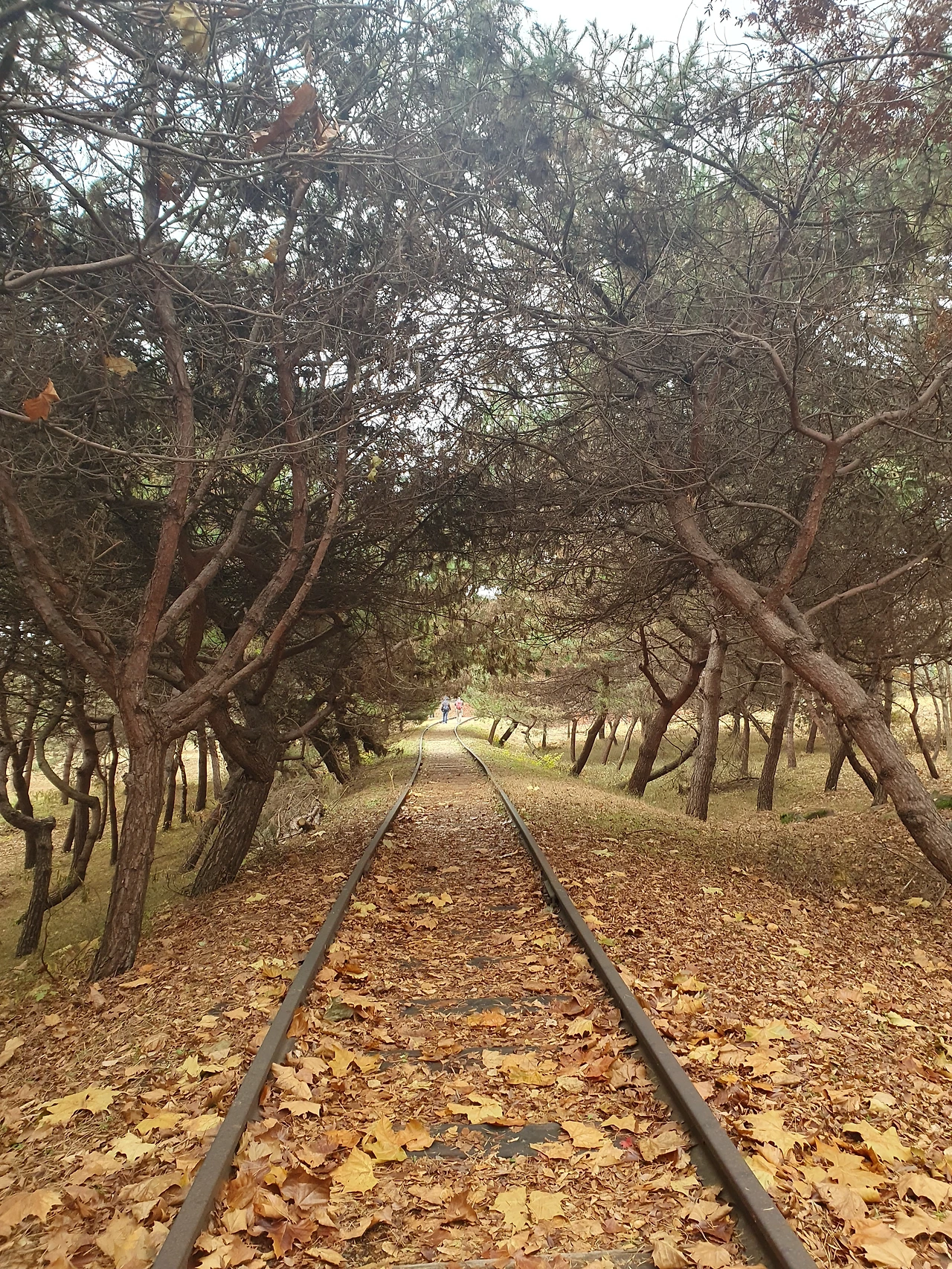 단풍나무 터널을 지나 철길까지 걷게 되었을 때 ”좋다“라는 감탄사를 터트렸다. 남아 있는 추억 중 소중하게 각인되어있는 것은 철길에 관한 것이다. 영화에서 흔히 보았던 사랑하는 연인이 두 손을 잡고 철로길을 걷는 모습, 기차 소리를 듣겠다고 귀를 대고 있을 때 박동하는 심장 소리, 동요 ‘기찻길 옆 오막살이’를 함께 불렀던 아이들.