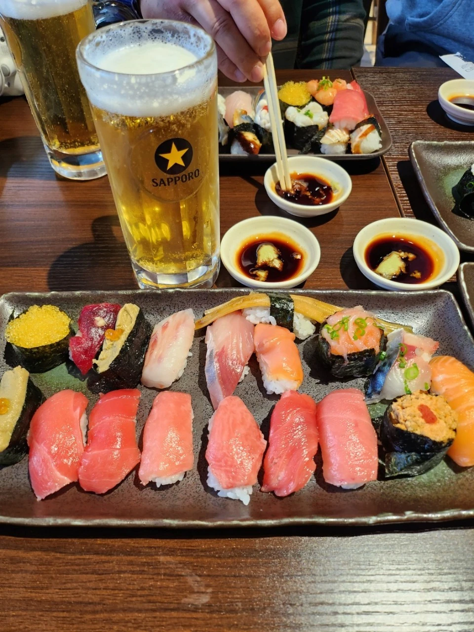 아이들은 짐을 풀자마자 오늘 점심은 “하카타항으로 가서 초밥을 먹겠다”라며 빨리 택시를 타자고 한다. 두 대에 나누어 도착한 곳이 완강 스시인데 대기 줄이 길다. 예약을 하고 1시간 정도를 기다렸더니 순서가 온다. 초밥 하나에 1,000원이니까 비싸지 않다. 맥주와 함께 20개를 먹었다. ㅋㅋ