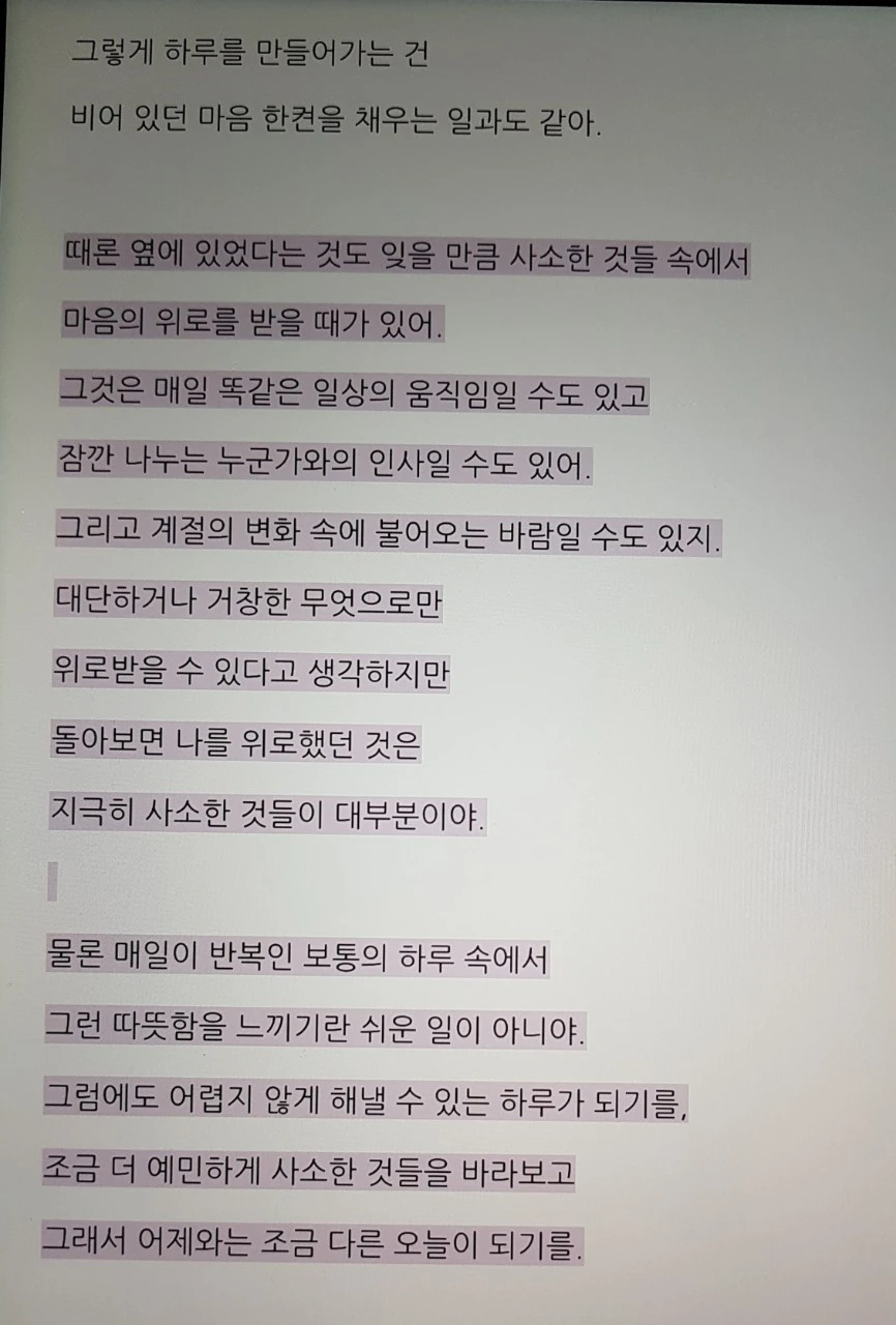 안주(安住)와 습관적 삶에 익숙한 장면은 좋은 삶을 사는데 가장 큰 장애물이다. 자신의 삶을 관찰하면 오늘도 내 삶은 좋은 것으로 채워져 있다. 문제는 모르거나, 찾지 않기에 발견하지 못하는 것뿐이다.