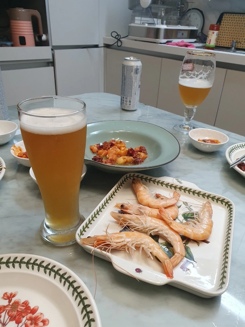 아내는 멍게를 손질하고 피조개와 왕새우는 삶아 식탁 위에 놓았습니다. 거기에 맥주. 이 시간이 좋은 이유는 대화를 하기 때문입니다. 언제나 이야기의 주제는 두 가지입니다.