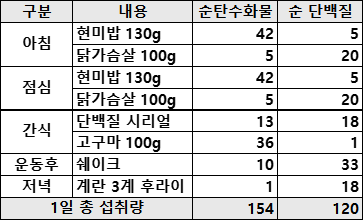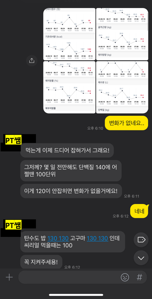 PT선생님에게 인바디 결과를 보내니 먹는 게 잡혀가는 중이라고 했다. 사실 아직 저 말을 100% 이해하지는 못했는데, 단백질과 탄수화물의 양을 계산해서 꼭 맞춰서 먹어야 한다는 말 같다. 그동안에는 대충 어림짐작으로 먹는 걸 때려 넣었다면 이제는 그렇게 해서는 원하는 몸을 만들 수 없었다.