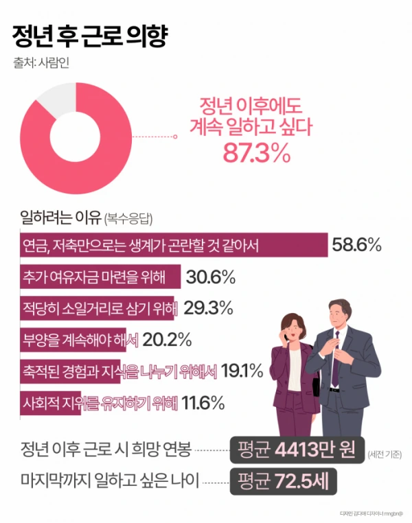 성인 남녀 4056 대상으로 ‘정년 후 근로 의향’을 조사한 결과 10명 중 9명이 은퇴 후에도 일을 하고 싶어 한다고 조사됐다. 연령별로 50대는 95.8%가, 40대는 81.9%, 30대는 74.4% 순이었다. 30대의 비율이 70%가 넘는다는 결과가 매우 놀라울 정도다.