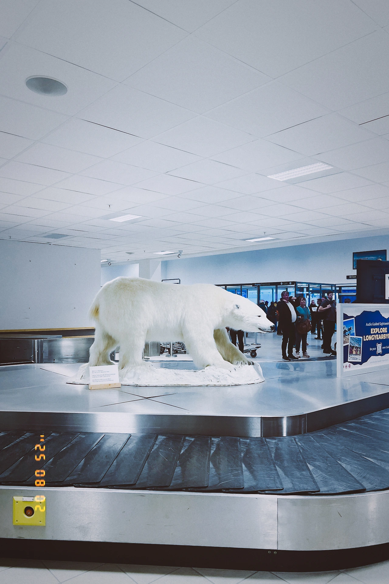 롱이어비엔 공항으로 들어서니 아직은 멈춰있는 컨베이어 벨트 위에 북극의 상징, 북극곰이 우리를 맞이했다. 못 보고 가면 아쉽겠지만, 보는 건 너무 무서울 것 같다. 어쩌면 이렇게 모형으로 보는 것이 가장 가까이서 관찰할 수 있는 유일한 방법일지도 모르겠다.