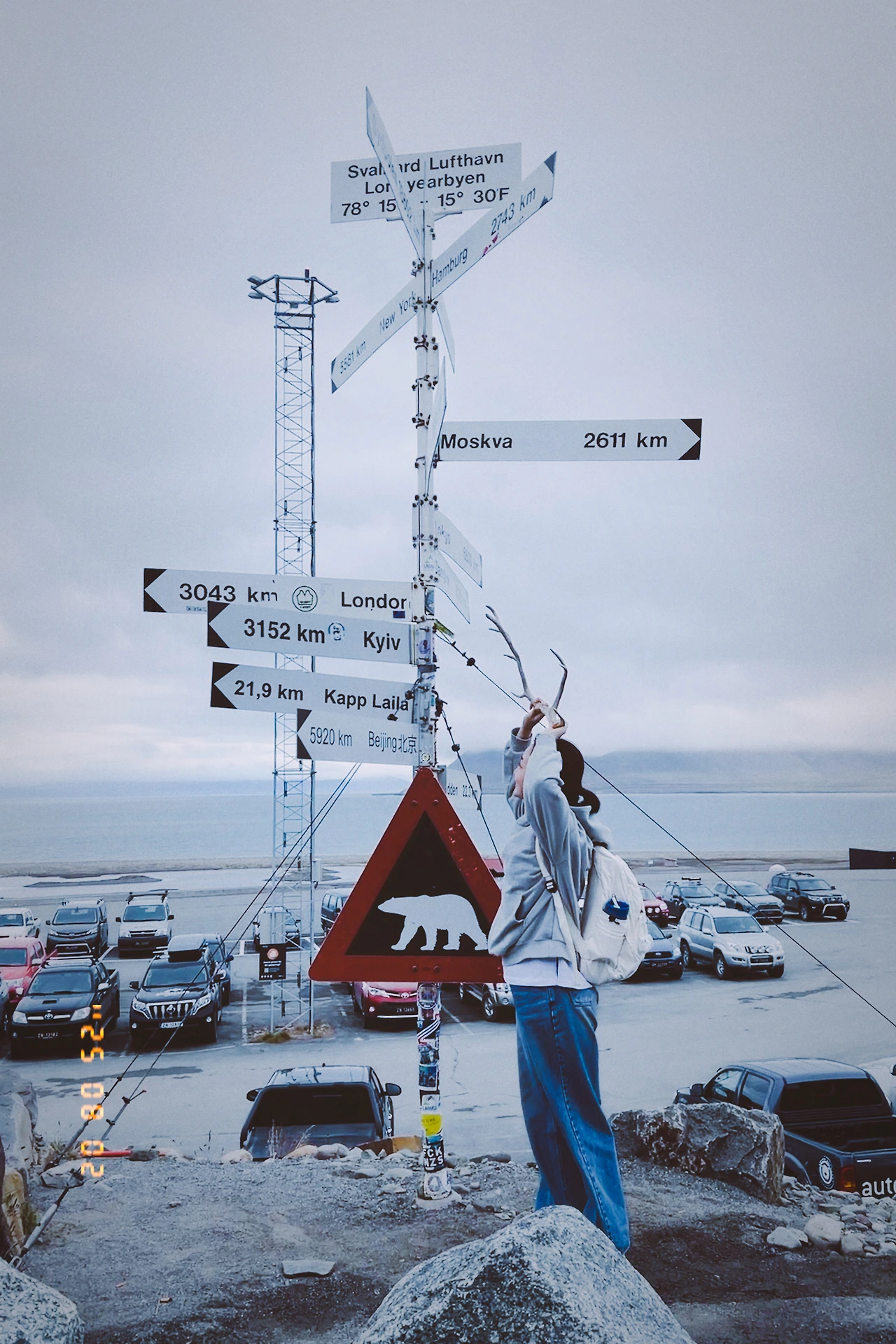 차가운 바람, 순록의 뿔, 북위 78도가 적힌 표지판.
