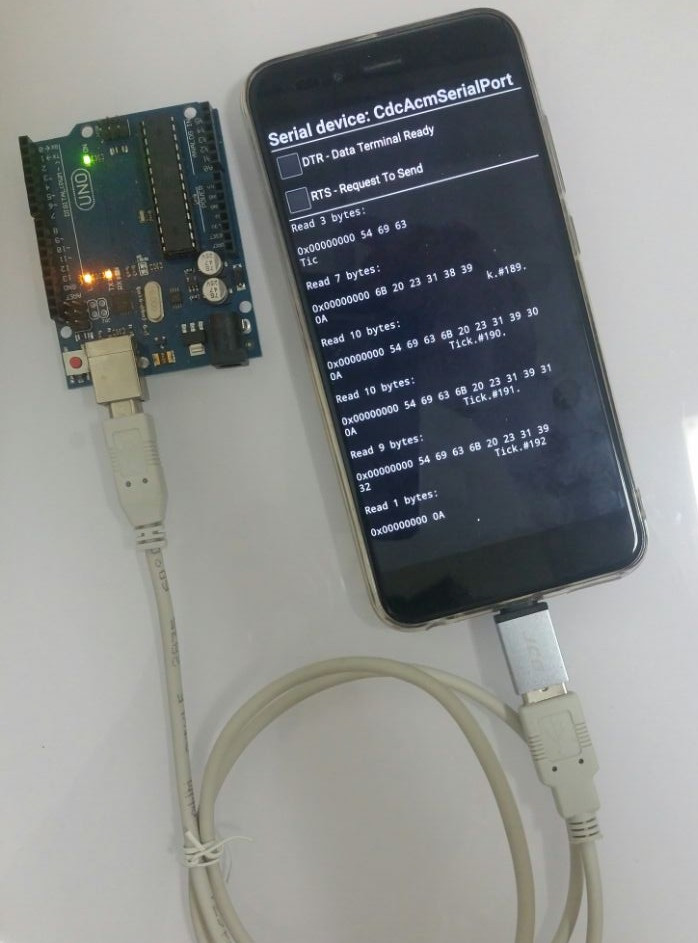 스마트폰과 아두이노를 usb serial로 연결하여, 아두이노에서 임으로 생성된 숫자 값을 스마트폰에서 받아 출력하는 모습이다.