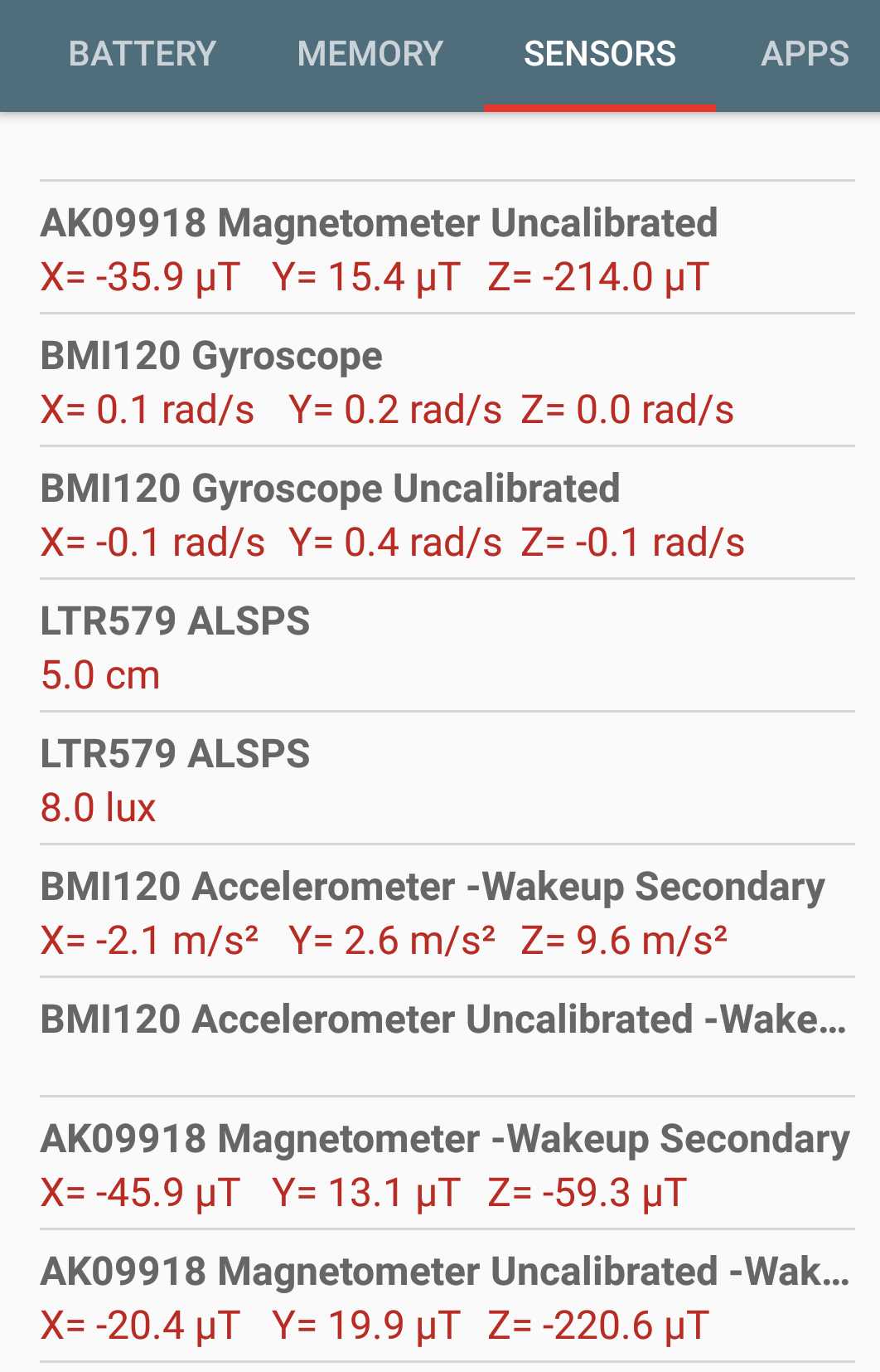 device info 안드로이드앱을 통해서 본 센서 정보값들.